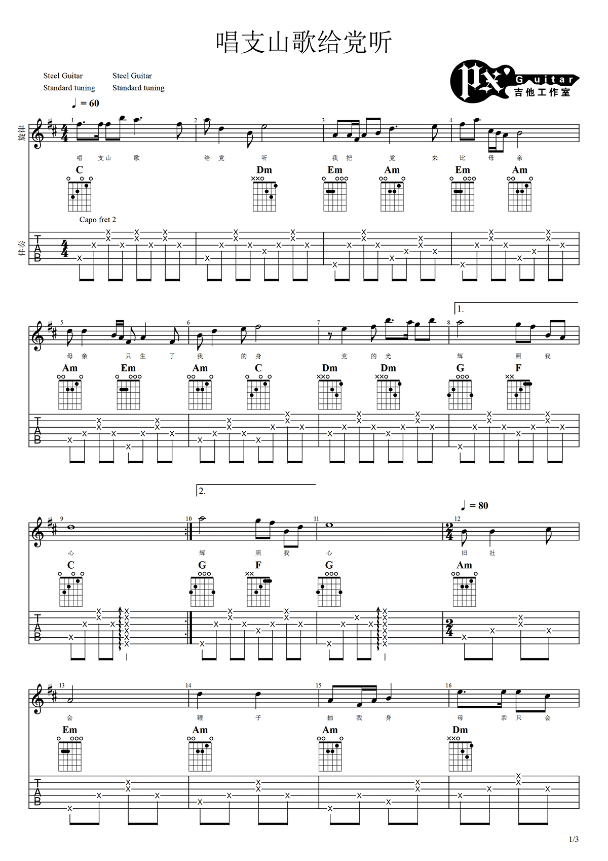 《《唱支山歌给党听吉他谱》》内容来自于互联网,不能保证内容的准确性与完整性,仅供学习交流欣赏,请勿用于其它用途,内容版权归原作者及来源网站所有,如有侵犯到您的权益请来信告知,我们将及时删除。