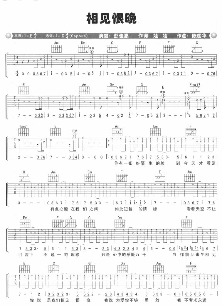 《彭佳慧《相见恨晚吉他谱》(C调)》内容来自于互联网,不能保证内容的准确性与完整性,仅供学习交流欣赏,请勿用于其它用途,内容版权归原作者及来源网站所有,如有侵犯到您的权益请来信告知,我们将及时删除。