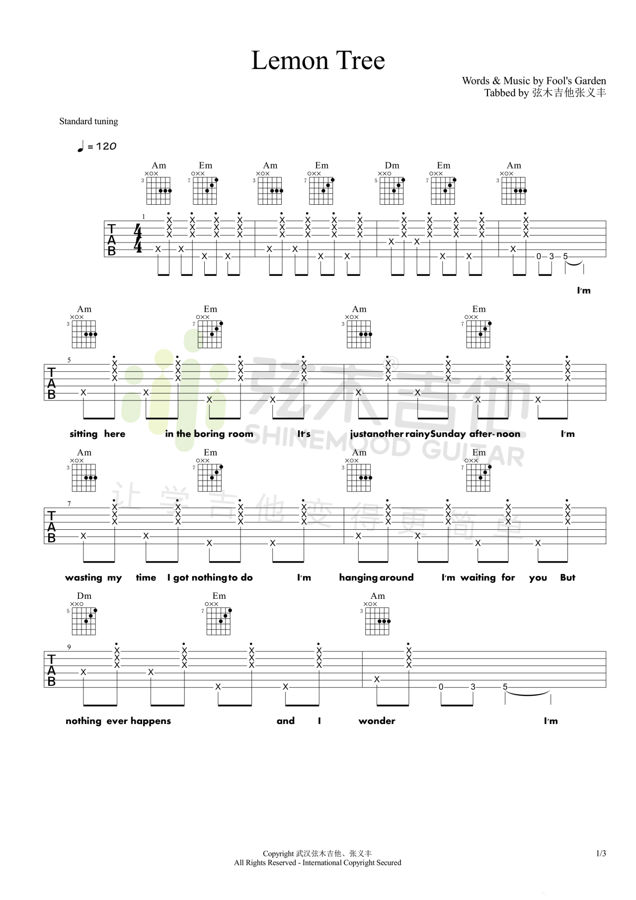 《Lemon Tree》吉他谱来自Fools Garden的经典英文歌曲,原调C,男生变调夹第2品低八度演唱更佳。女生唱可考虑降半音调弦。共有三张高清图片谱,感谢弦木吉他的编配。谱中涉及左手断音技巧,可通过柠檬树吉他弹唱视频学习。张老师的演示带你领略这首美国乡