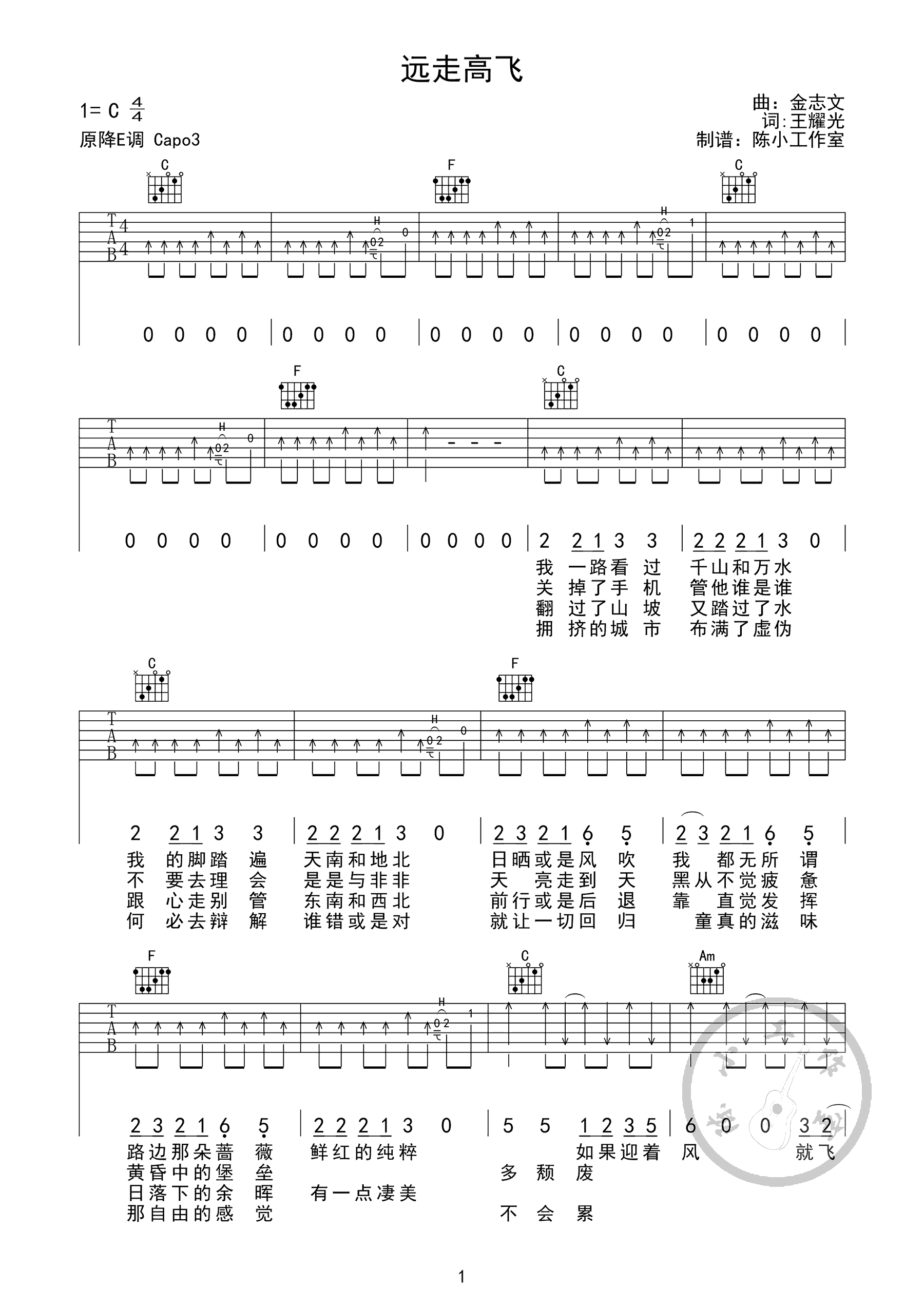 《金志文《远走高飞吉他谱》(C调)》内容来自于互联网,不能保证内容的准确性与完整性,仅供学习交流欣赏,请勿用于其它用途,内容版权归原作者及来源网站所有,如有侵犯到您的权益请来信告知,我们将及时删除。
