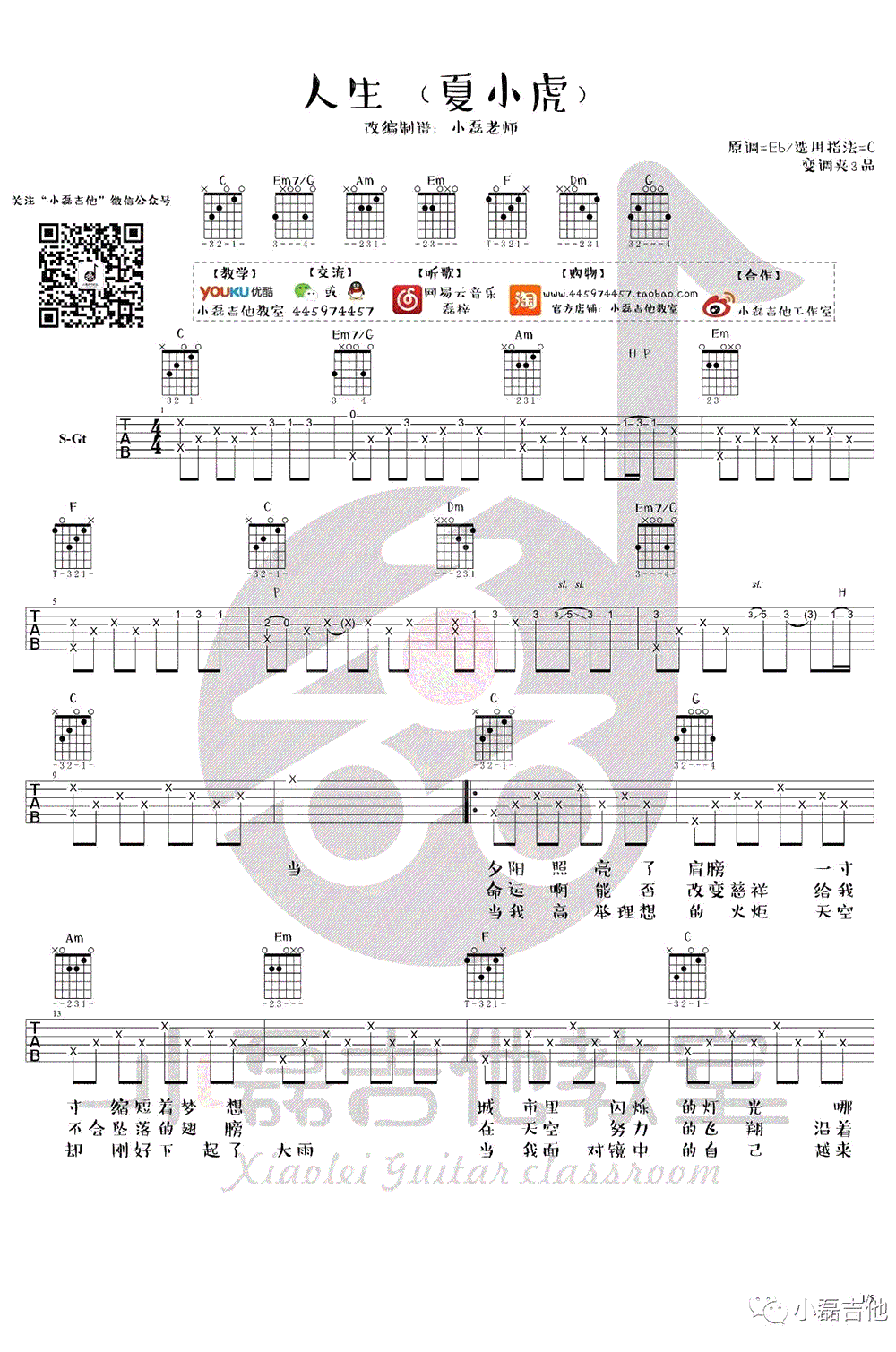 夏小虎的民谣《人生》以清新吉他旋律为基调,采用原调EB,C调指法编配,变调夹夹3品。曲谱呈现在六线谱上,共包含五张高清图片谱。感谢小磊吉他的巧妙编排,提供了专业的吉他弹唱教学示范。在人生旅途中,或许最大的壮举就是在认清生活的残酷本质后,仍然怀抱对未来美好的信仰