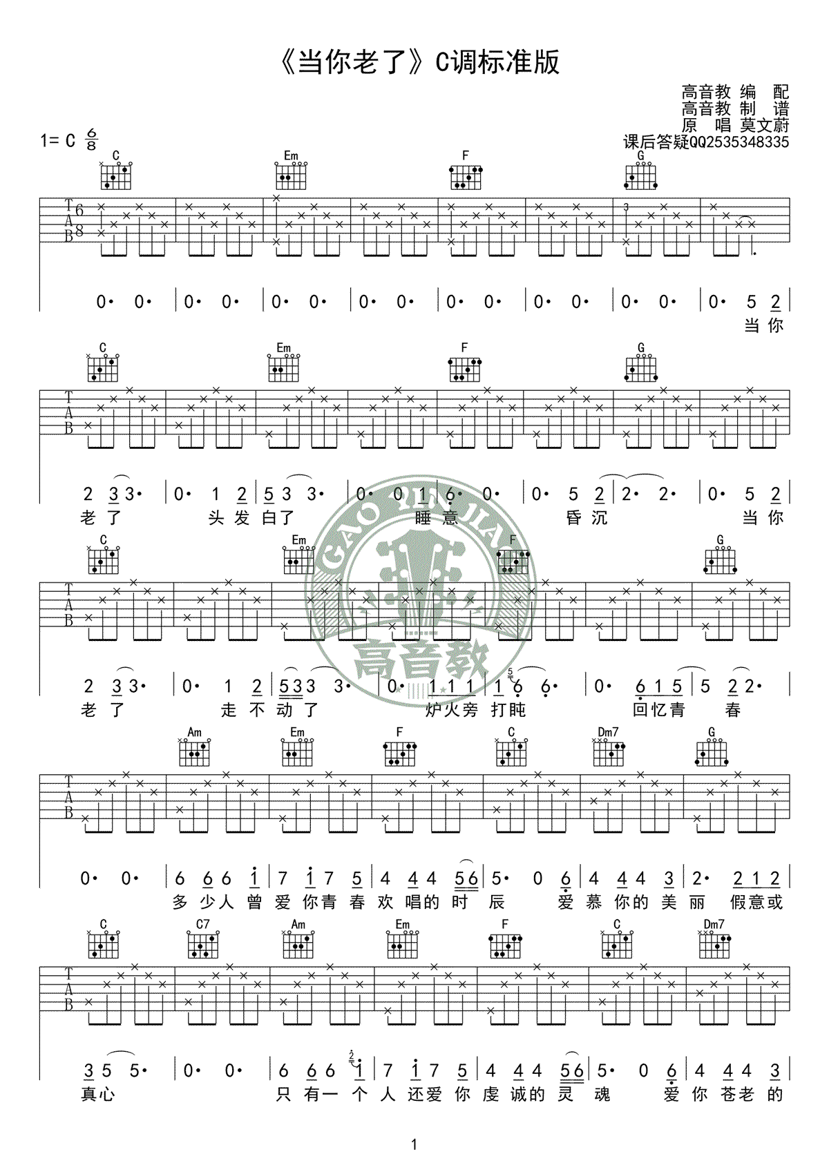 《莫文蔚《当你老了吉他谱》(C调)》内容来自于互联网,不能保证内容的准确性与完整性,仅供学习交流欣赏,请勿用于其它用途,内容版权归原作者及来源网站所有,如有侵犯到您的权益请来信告知,我们将及时删除。