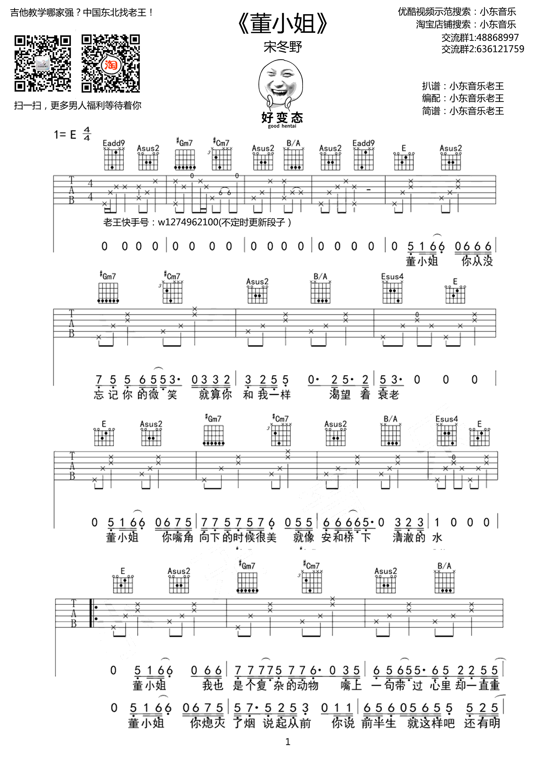 《宋冬野《董小姐吉他谱》(E调)》内容来自于互联网,不能保证内容的准确性与完整性,仅供学习交流欣赏,请勿用于其它用途,内容版权归原作者及来源网站所有,如有侵犯到您的权益请来信告知,我们将及时删除。