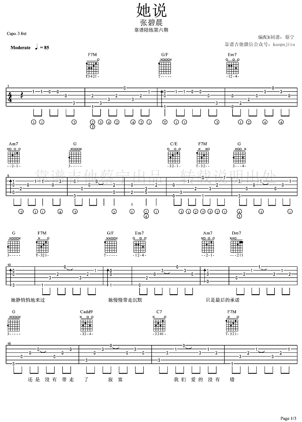 《张碧晨《她说吉他谱》(C调)》内容来自于互联网,不能保证内容的准确性与完整性,仅供学习交流欣赏,请勿用于其它用途,内容版权归原作者及来源网站所有,如有侵犯到您的权益请来信告知,我们将及时删除。