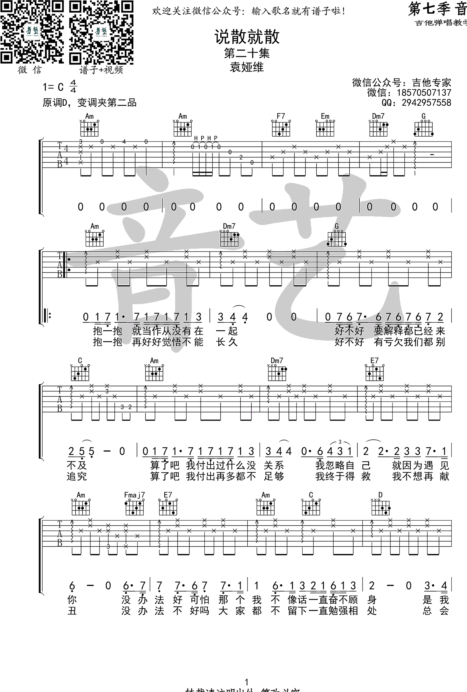 袁娅维《说散就散吉他谱》(C调)