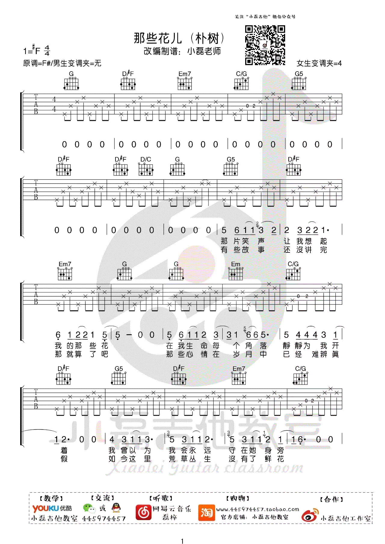 朴树演唱的《那些花儿》吉他谱以原调#F呈现,男生无需变调夹,女生则需在第4品夹夹。由小磊吉他精心编排和提供的弹唱讲解教学,配有四张高清图片谱,完美呈现了这首经典歌曲。小磊老师的乐谱在保持原版风格的同时,对吉他部分进行了精准诠释,整体难度较低,非常适合基础较差的