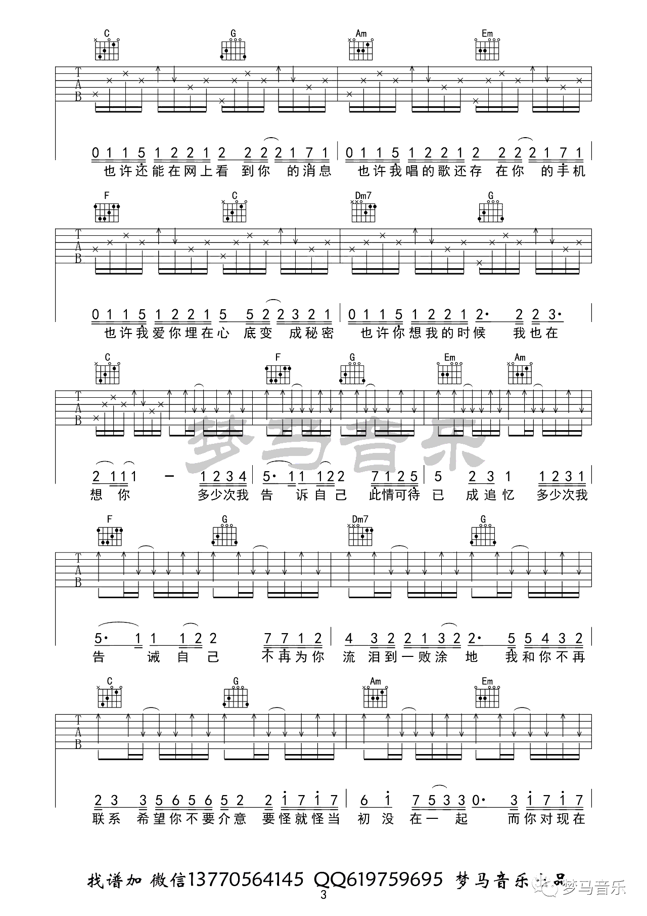 夏天Alex创作并演唱的治愈系情歌《不再联系》的吉他谱呈现在六线谱上,采用了C调指法,共包含五张高清图片谱。感谢梦马音乐的编配,让这首简单难度的弹唱歌曲更富饱满的音乐层次。夏祯阳老师在编配中注入了自己对歌曲旋律的理解,在原曲基础上加入了和声,使得整首歌更加动听