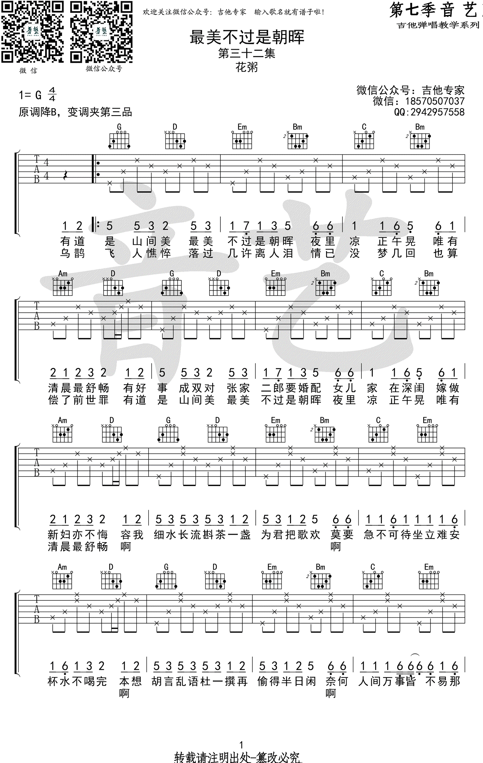 《花粥《最美不过是朝晖吉他谱》(G调)》内容来自于互联网,不能保证内容的准确性与完整性,仅供学习交流欣赏,请勿用于其它用途,内容版权归原作者及来源网站所有,如有侵犯到您的权益请来信告知,我们将及时删除。