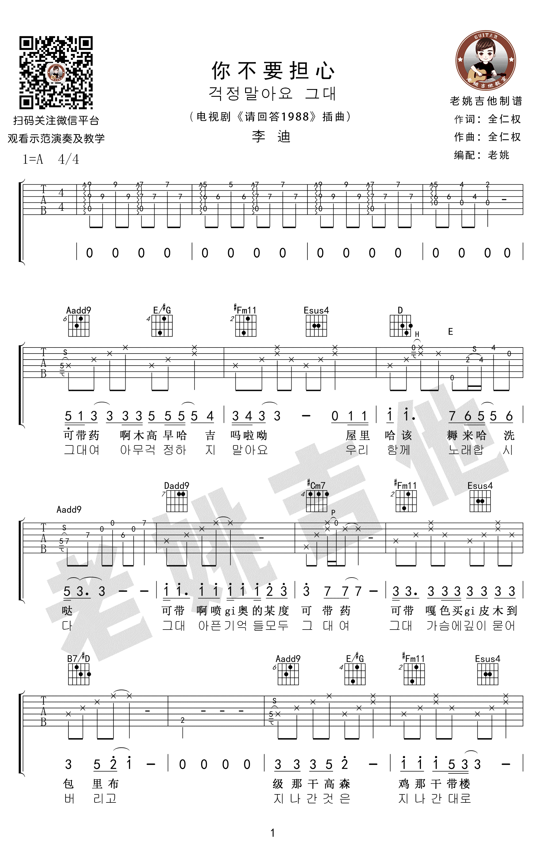李迪演绎的《你不要担心》吉他谱,是韩剧《请回答1988》中的插曲。这份六线谱以A调编排,由老姚吉他精心编配,共附有四张高清谱图。在感谢老姚的辛勤工作和提供的弹唱演示及解说的同时,我们为大家推荐了《看谱啦》。不仅提供了谱图,还附有吉他教学视频,让你可以跟着老姚老