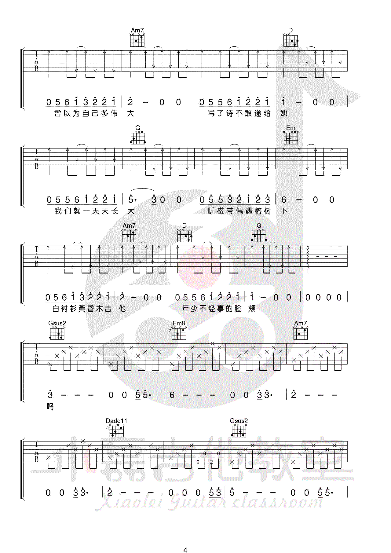 刘昊霖演唱的《儿时》是一首充满诗意怀旧的民谣与流行风格的歌曲,以G调指法为基础的六线谱,由小磊吉他编配和提供教学视频。这首歌的旋律委婉动听,歌词富有情感,让人仿佛回到了儿时童趣时光。共有五张图片谱,通过看谱啦推荐分享,让更多人能够轻松学习。教学视频由小磊吉他亲