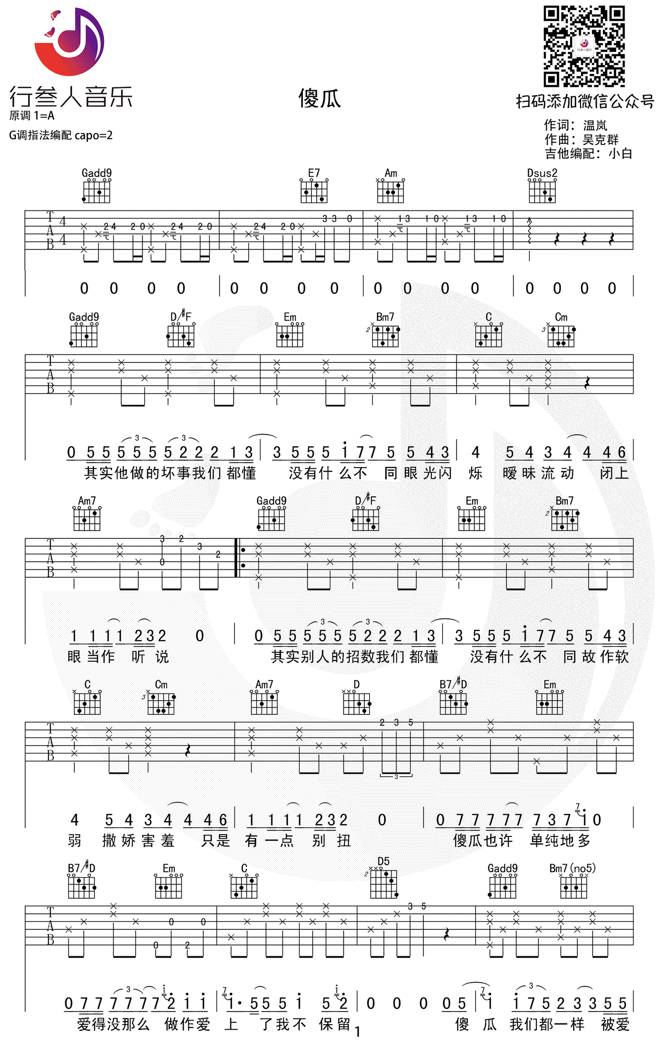 温岚演唱的《傻瓜》是一首都市情歌,由吴克群作词作曲。这首歌使用了傻瓜六线谱,原调A,选用G调指法,Capo夹2品。谱表由行叁人编配,提供了三张高清图片谱。感兴趣的人可以通过看谱啦平台获取并分享这份谱表。