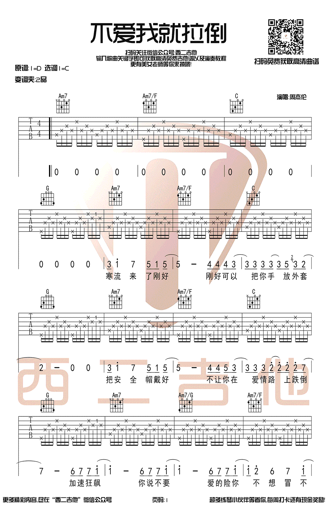 您现在的位置是:首页 > 吉他谱 > 西二《不爱我就拉倒吉他谱》(C调) 西二《不爱我就拉倒吉他谱》(C调) 日期:2024-05-07 08:10:01 西二 周杰伦最新歌曲《不爱我就拉倒》吉他谱,以D调原曲为基础,使用C调指法并使用变调夹2品的方式演奏。这份谱子由西二吉他制作,包含五张高清六线谱,为乐手们提供了学习和分享的机会。
