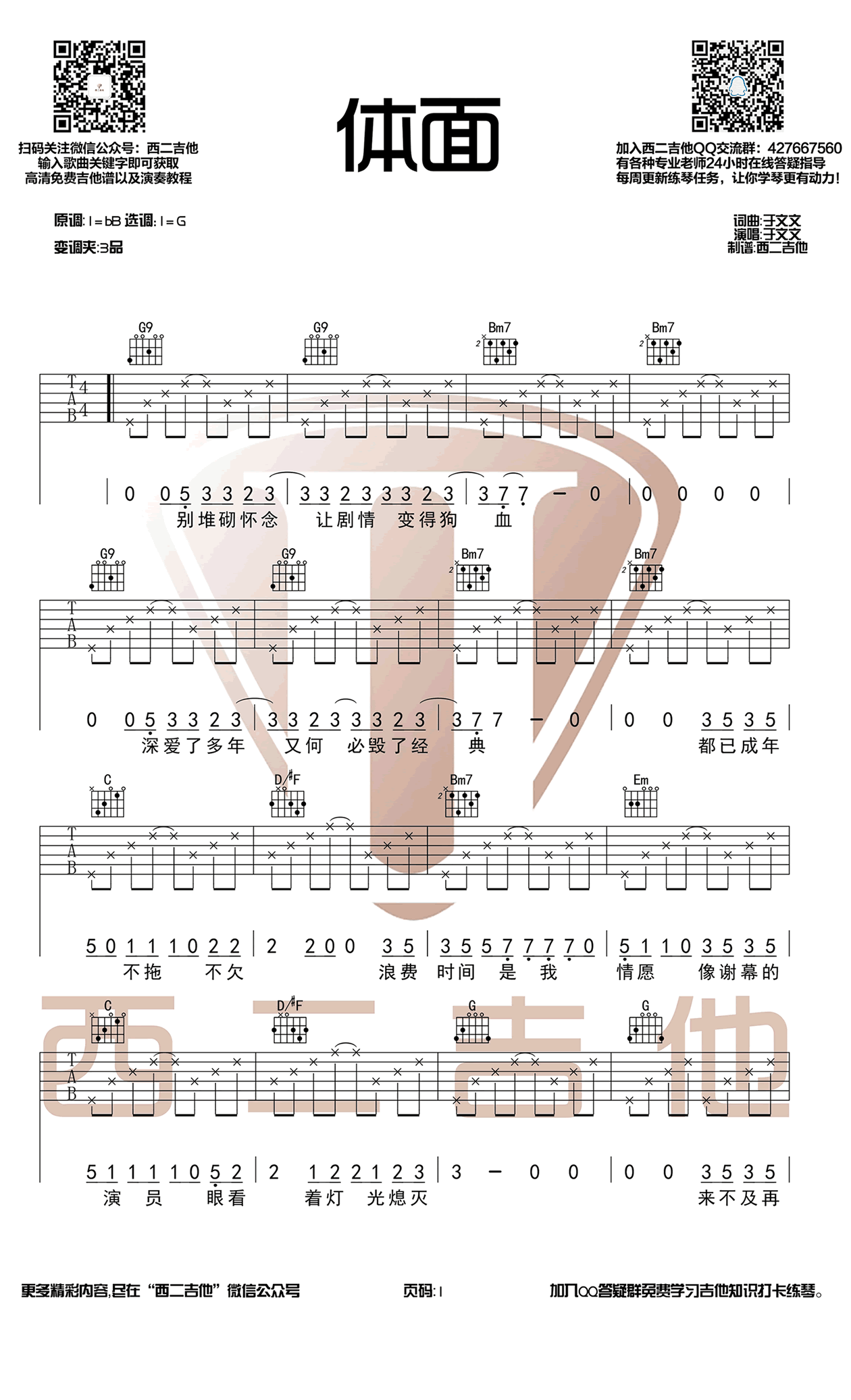 这首歌曲是由于文文在电影《前任3》中演唱的插曲,《体面》的吉他谱。谱子采用六线谱,原调为bB,采用G调指法,使用变调夹夹在3品。配有三张高清图片谱,展示了曲谱的细节。吉他爱好者可欢迎收藏分享,特别适合使用西二吉他编配。这首歌以其动人旋律和深情歌词而备受欢迎,让