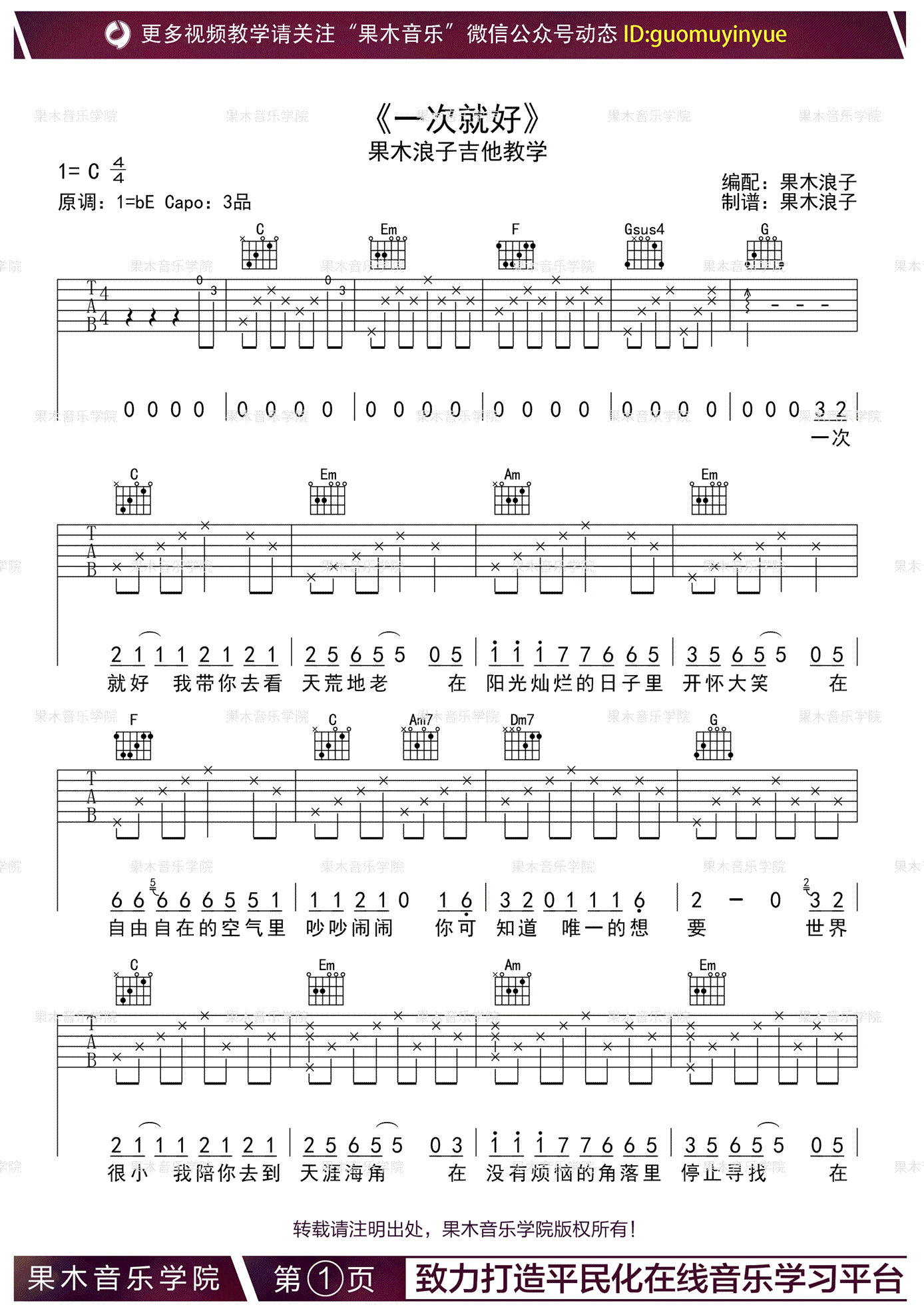 《杨宗纬《一次就好吉他谱》(C调)》内容来自于互联网,不能保证内容的准确性与完整性,仅供学习交流欣赏,请勿用于其它用途,内容版权归原作者及来源网站所有,如有侵犯到您的权益请来信告知,我们将及时删除。