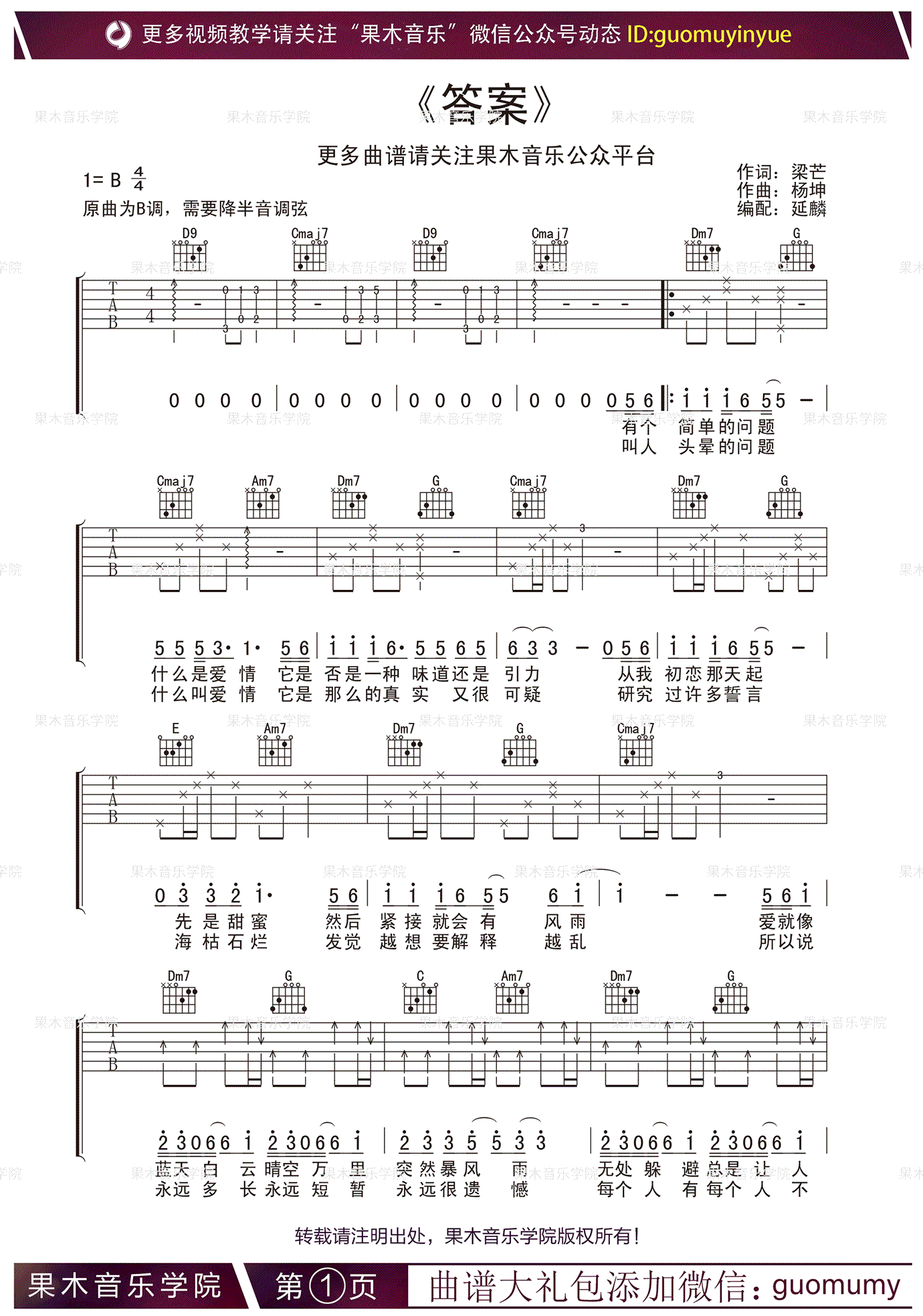 《答案》吉他谱呈现了杨坤和郭采洁的深情对唱,曾荣获东方风云榜最佳对唱奖。由果木音乐提供的弹唱谱以B调为原调,需要调弦至降半音。三张高清谱图生动展示了编配的精妙之处。感谢果木音乐的悉心编排,看谱啦每日更新,为吉他爱好者提供精彩分享。《答案》的音乐旋律如甜蜜的糖果