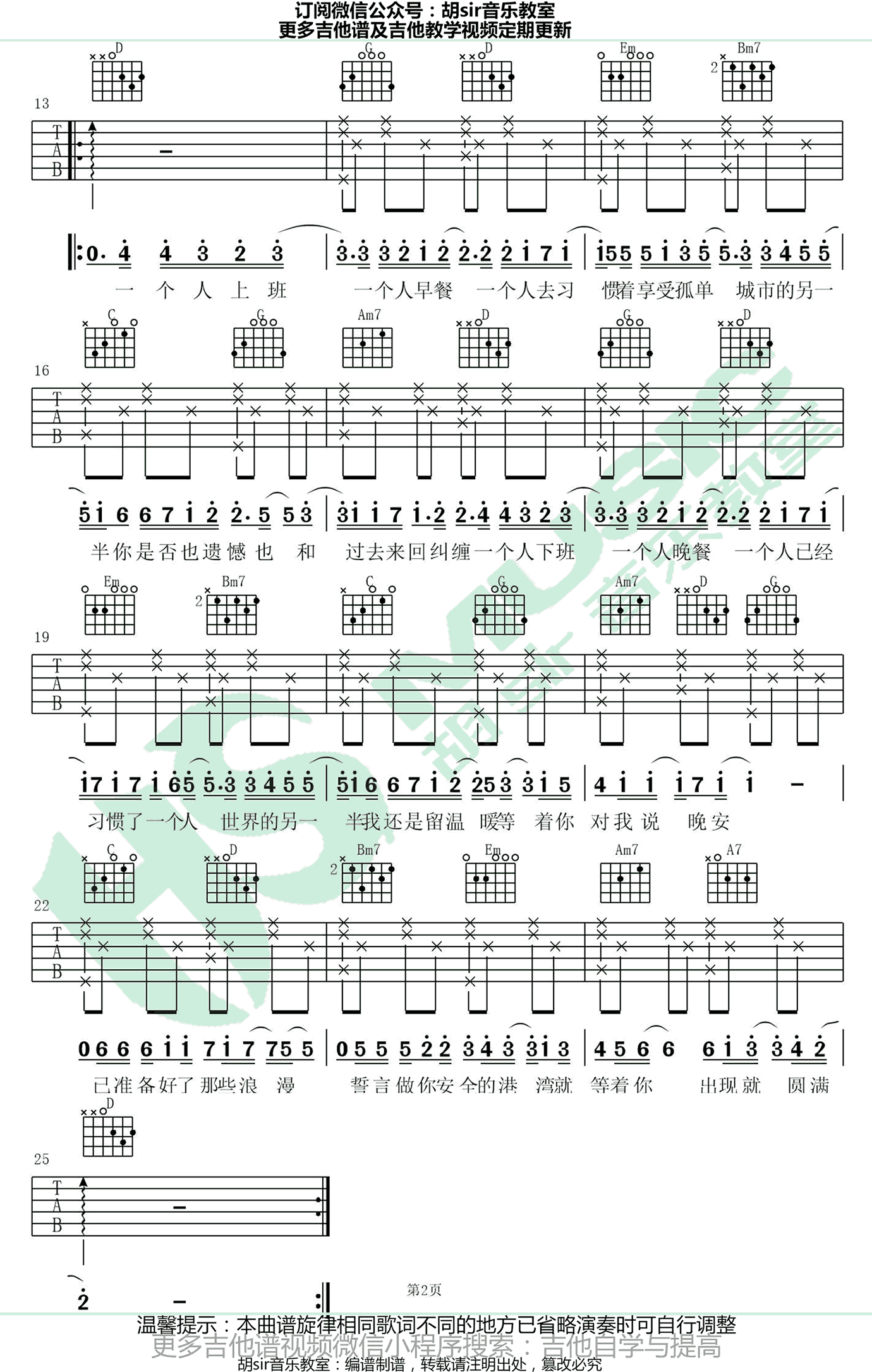 卢焱演唱的《一个人》是一首温暖的民谣歌曲,以吉他为伴奏。谱中使用六线谱,原调为A,适度使用变调夹夹2品,选用G调指法。适合男生演唱,建议使用夹2品的变调夹。整个吉他弹唱谱由胡Sir巧妙编排,呈现出深情而富有层次感的音乐表达。这首歌曲通过一个人的吉他演奏,展现了