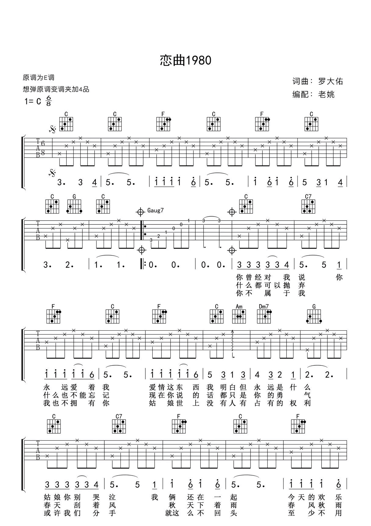 《罗大佑《恋曲1980 C调吉他谱》(C调)》内容来自于互联网,不能保证内容的准确性与完整性,仅供学习交流欣赏,请勿用于其它用途,内容版权归原作者及来源网站所有,如有侵犯到您的权益请来信告知,我们将及时删除。
