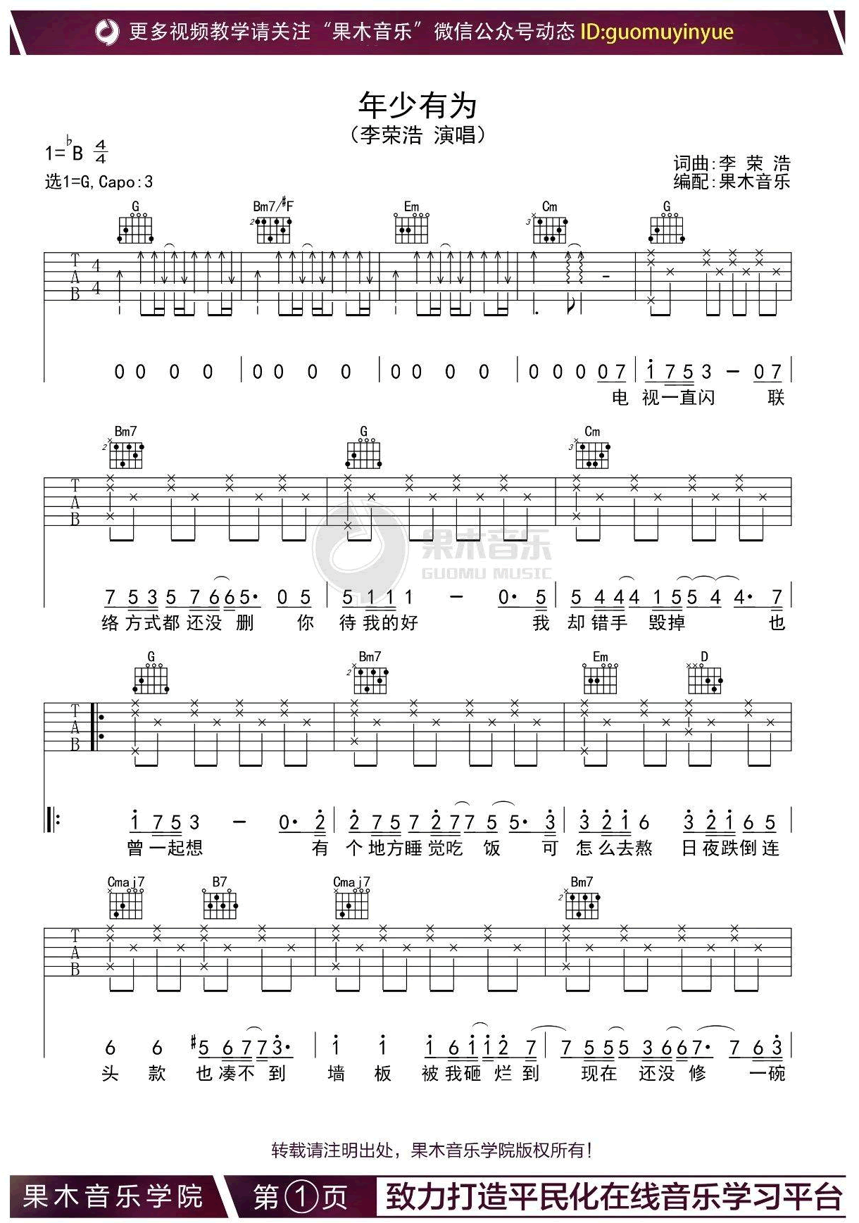 《李荣浩《年少有为吉他谱》(G调)》内容来自于互联网,不能保证内容的准确性与完整性,仅供学习交流欣赏,请勿用于其它用途,内容版权归原作者及来源网站所有,如有侵犯到您的权益请来信告知,我们将及时删除。