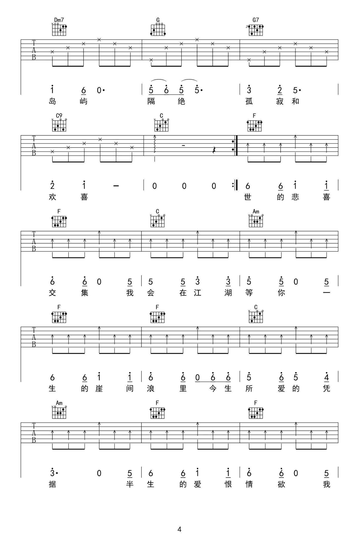 《江湖儿女》吉他谱是谭维维为贾樟柯执导的电影创作的主题曲。这首原调降E的曲子使用了变调夹夹第三品,提供了六线高清谱,总共六张完整编配的图片。谭维维的声音为电影注入了灵魂,悠扬的旋律与简洁而深刻的歌词相得益彰。这首歌曲在她的嗓音中展现出温柔而清新的特质,仿佛演绎