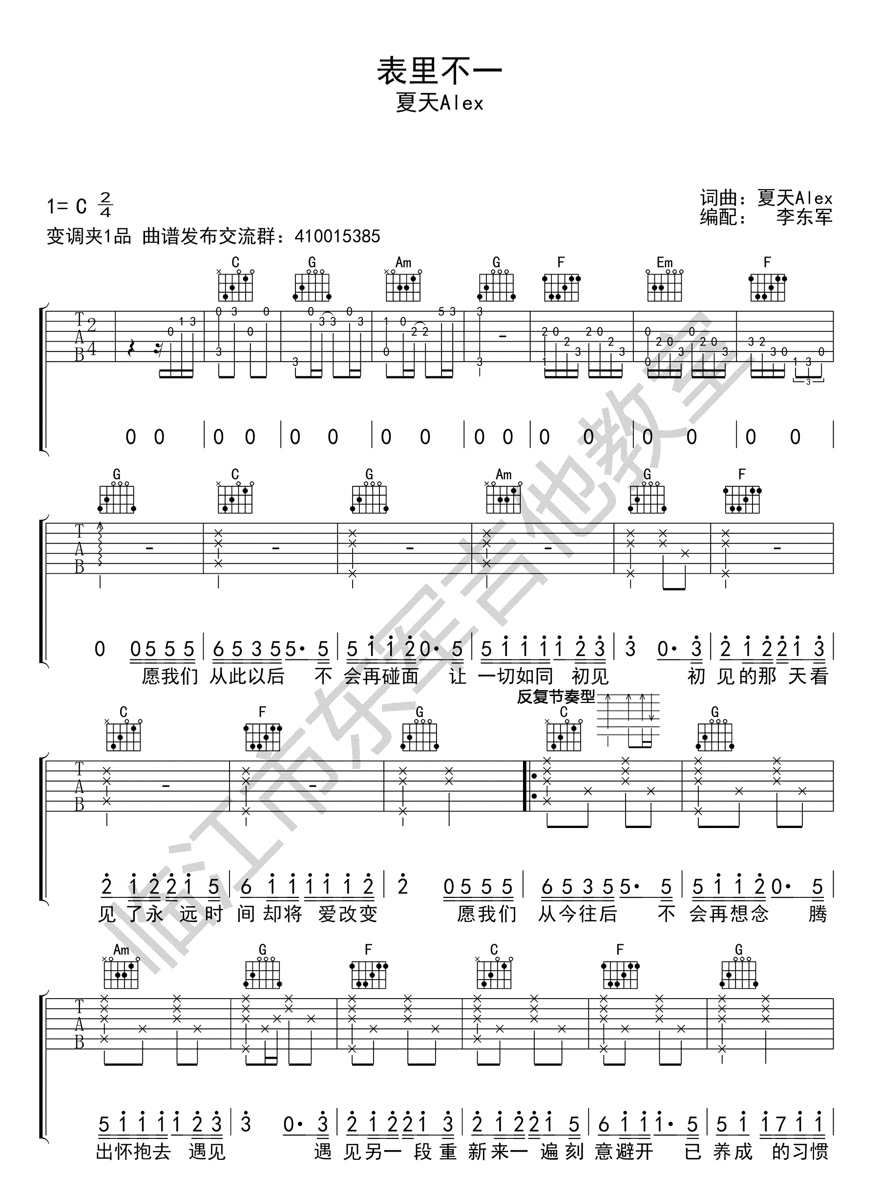 《夏天Alex《表里不一 C调吉他谱》(C调)》内容来自于互联网,不能保证内容的准确性与完整性,仅供学习交流欣赏,请勿用于其它用途,内容版权归原作者及来源网站所有,如有侵犯到您的权益请来信告知,我们将及时删除。