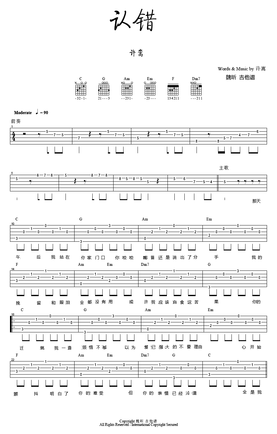 《许嵩《认错吉他谱》(C调)》内容来自于互联网,不能保证内容的准确性与完整性,仅供学习交流欣赏,请勿用于其它用途,内容版权归原作者及来源网站所有,如有侵犯到您的权益请来信告知,我们将及时删除。