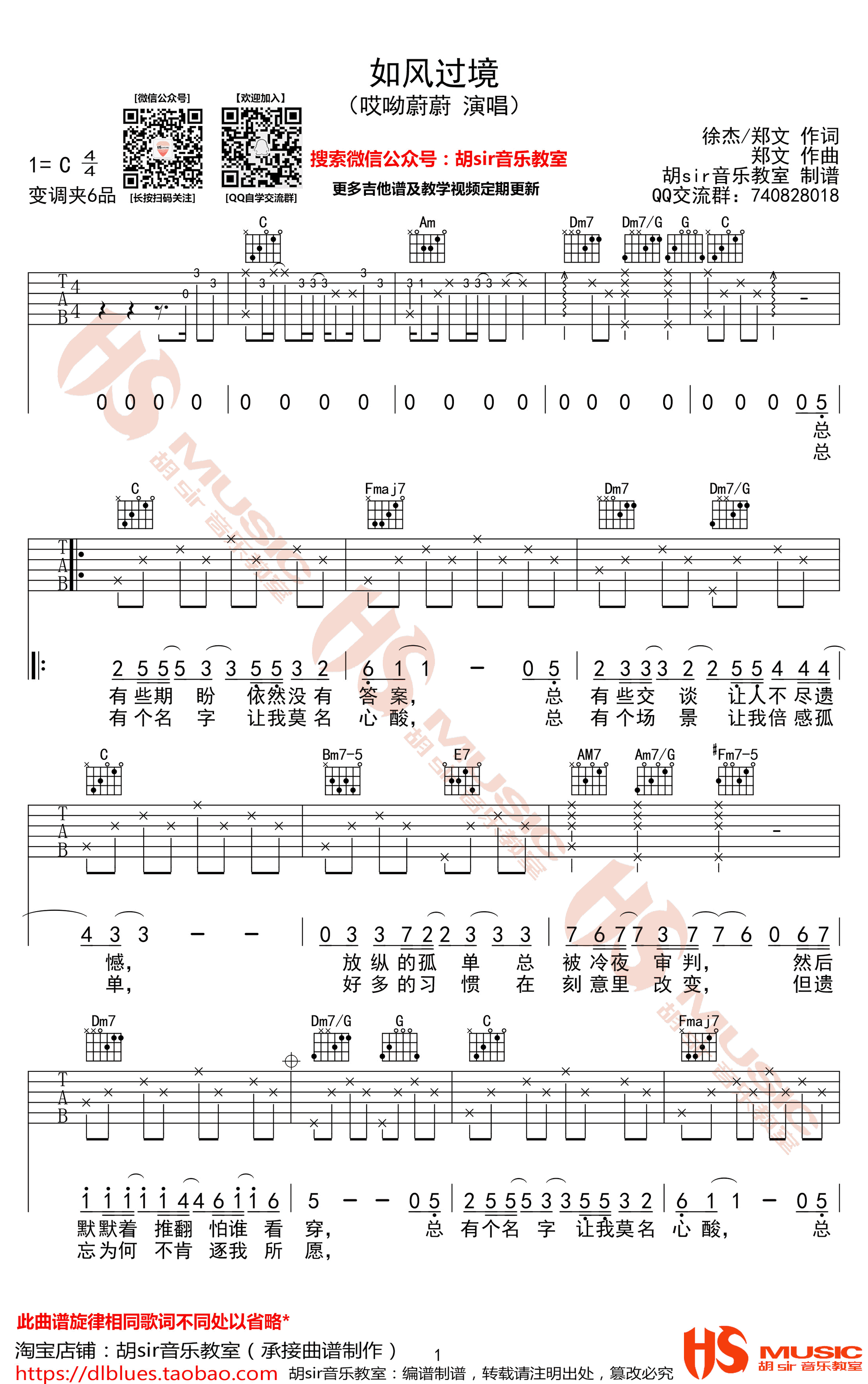 这首吉他曲《如风过境》以C调为基调,Capo夹六品,由胡sir编配的高清图片谱展现了其独特韵味。演唱者哎哟蔚蔚通过这六线谱,将如风拂过的意境娓娓道来。谱中旋律轻灵,如微风拂面,令人陶醉其中。整个编曲仿佛在述说一段动人心弦的故事,情感在指尖流转。这充满诗意的音符