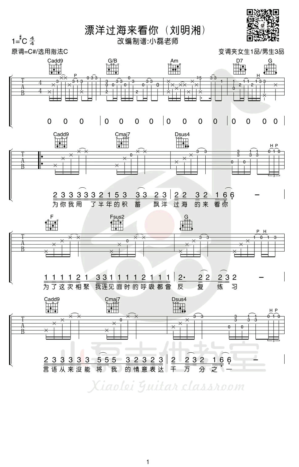 《漂洋过海来看你》吉他谱以刘明湘演唱版本为基础,感谢小磊吉他编配。李宗盛的原作由娃娃演唱,直到好声音版本出现前并不为大众所熟知。谱中前奏改编自原版的双吉他演奏,简化为单吉他演奏,类似指弹的小节适合学习和练习。后段弹唱部分略带难度,充满加花,但难度可接受,停留在