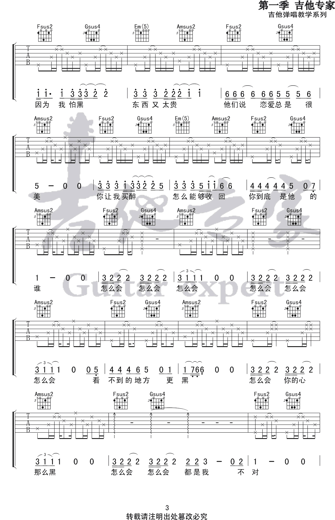 《《怕黑吉他谱》(C调)》内容来自于互联网,不能保证内容的准确性与完整性,仅供学习交流欣赏,请勿用于其它用途,内容版权归原作者及来源网站所有,如有侵犯到您的权益请来信告知,我们将及时删除。