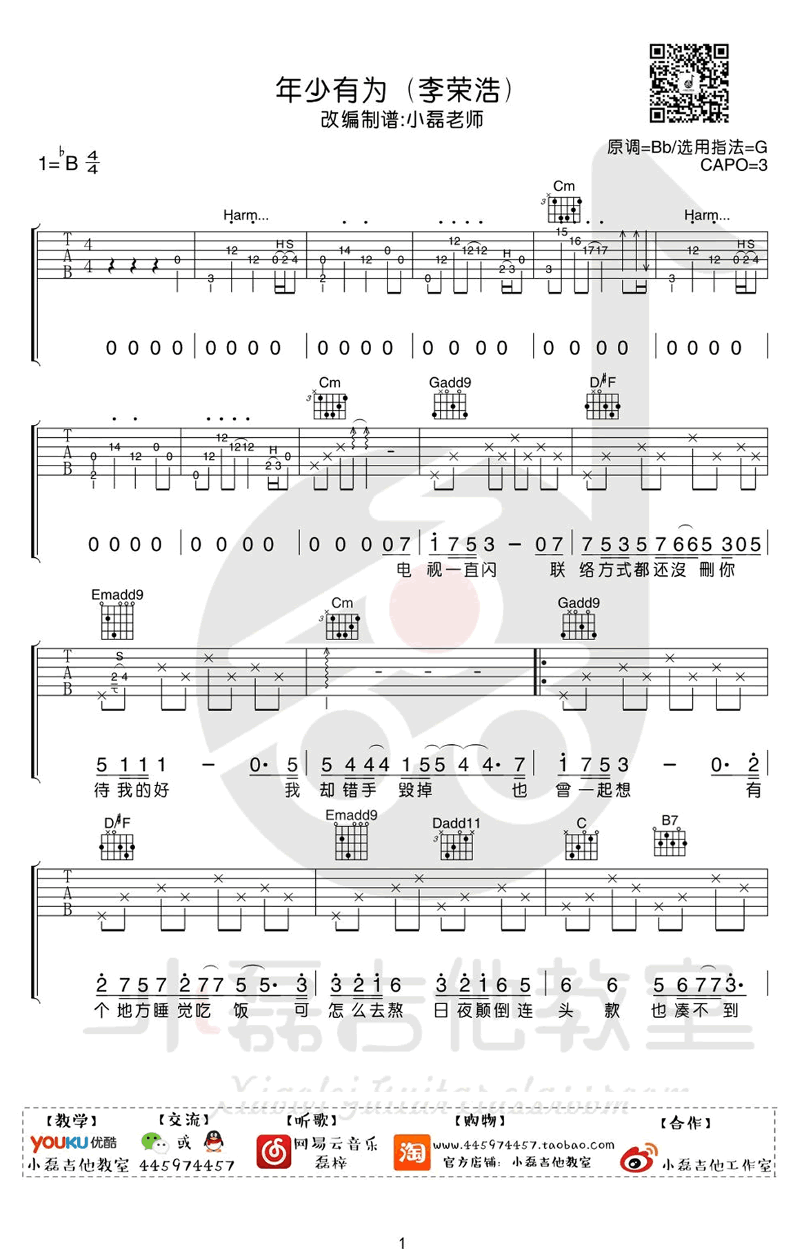《李荣浩《年少有为吉他谱》(G调)》内容来自于互联网,不能保证内容的准确性与完整性,仅供学习交流欣赏,请勿用于其它用途,内容版权归原作者及来源网站所有,如有侵犯到您的权益请来信告知,我们将及时删除。