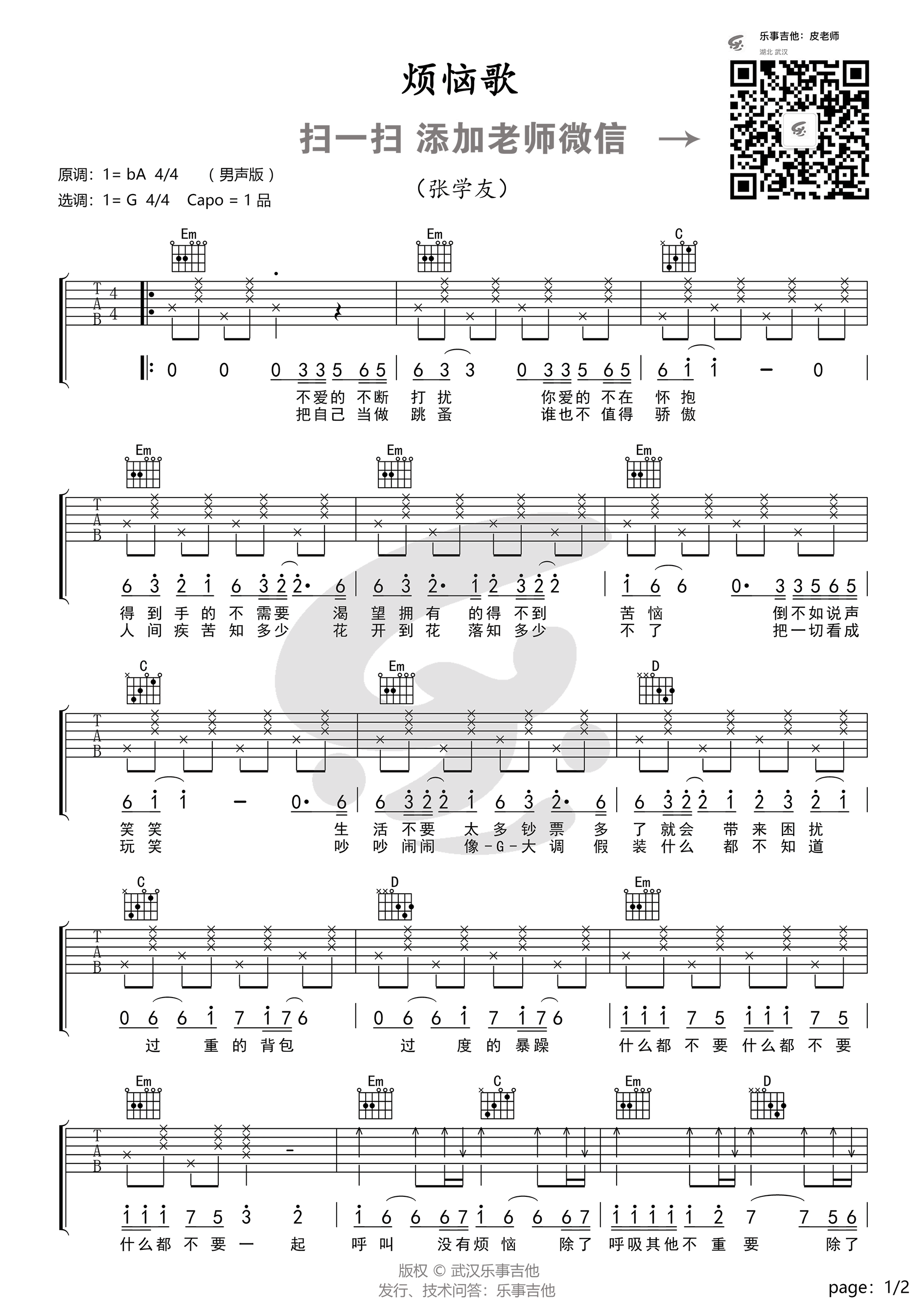 《张学友《烦恼歌吉他谱》(G调)》内容来自于互联网,不能保证内容的准确性与完整性,仅供学习交流欣赏,请勿用于其它用途,内容版权归原作者及来源网站所有,如有侵犯到您的权益请来信告知,我们将及时删除。