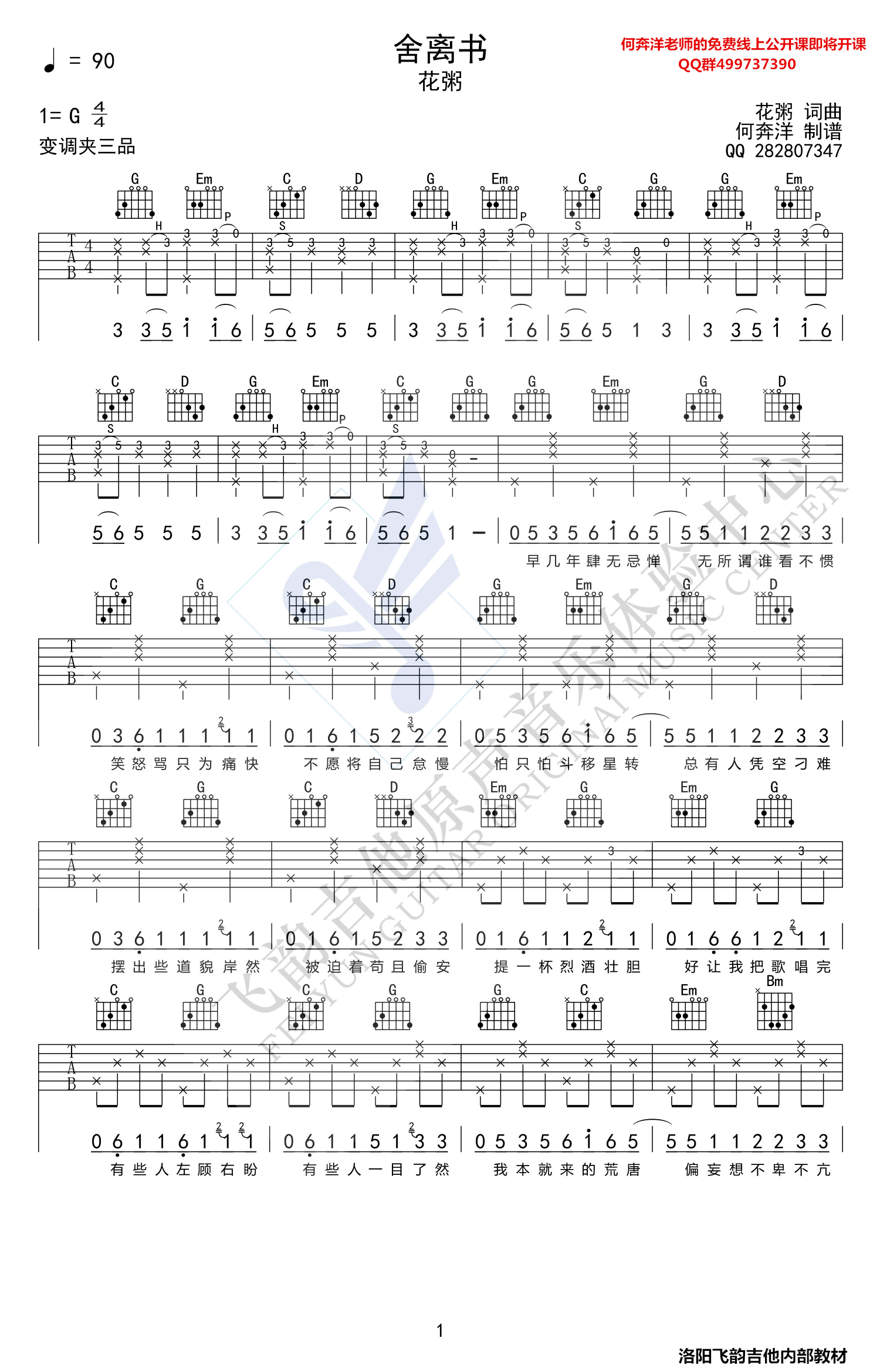 《花粥《舍离书吉他谱》(G调)》内容来自于互联网,不能保证内容的准确性与完整性,仅供学习交流欣赏,请勿用于其它用途,内容版权归原作者及来源网站所有,如有侵犯到您的权益请来信告知,我们将及时删除。