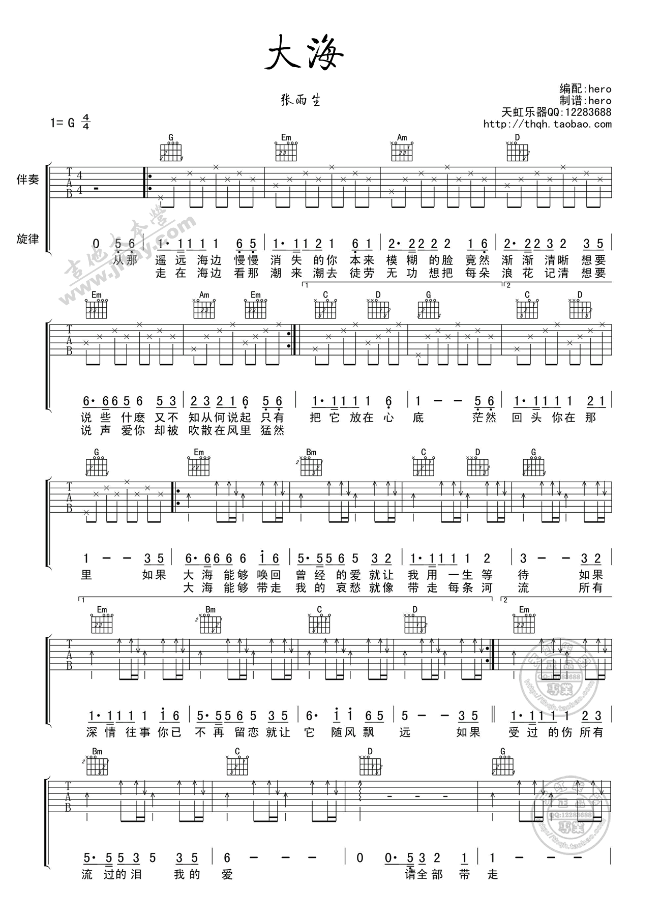 《张雨生《大海吉他谱》(G调)》内容来自于互联网,不能保证内容的准确性与完整性,仅供学习交流欣赏,请勿用于其它用途,内容版权归原作者及来源网站所有,如有侵犯到您的权益请来信告知,我们将及时删除。
