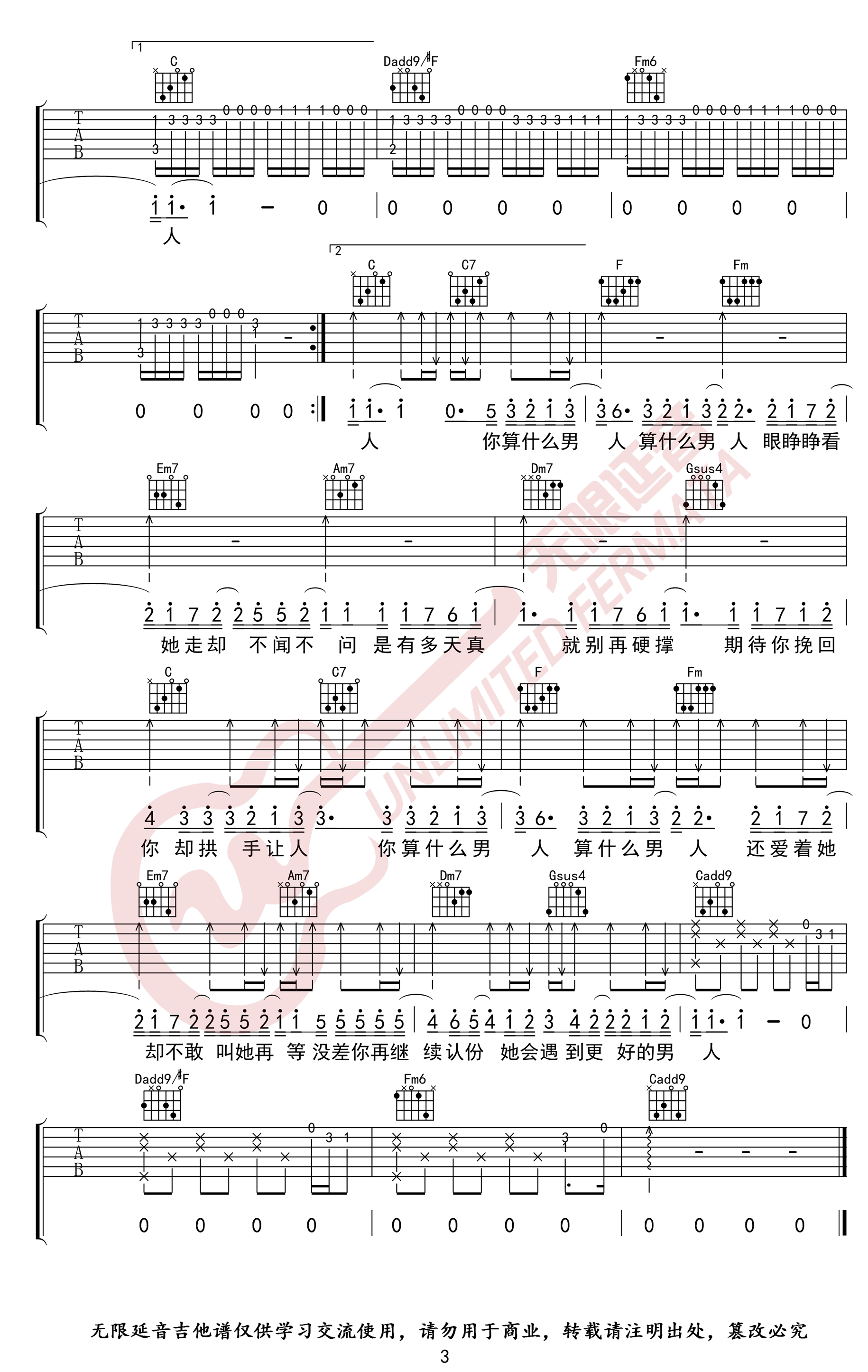 《周杰伦《算什么男人吉他谱》(C调)》内容来自于互联网,不能保证内容的准确性与完整性,仅供学习交流欣赏,请勿用于其它用途,内容版权归原作者及来源网站所有,如有侵犯到您的权益请来信告知,我们将及时删除。