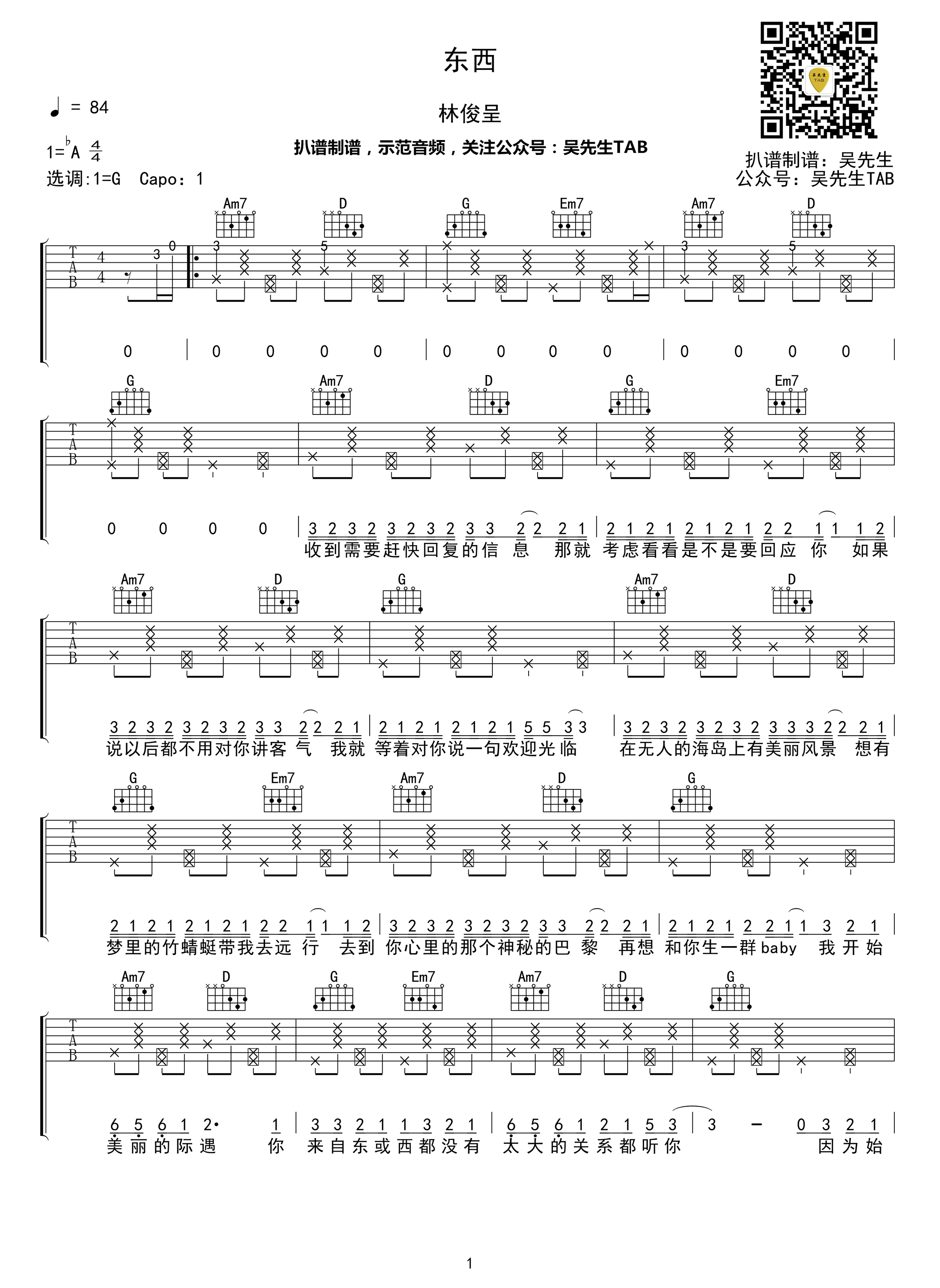 《林俊呈《东西吉他谱》(G调)》内容来自于互联网,不能保证内容的准确性与完整性,仅供学习交流欣赏,请勿用于其它用途,内容版权归原作者及来源网站所有,如有侵犯到您的权益请来信告知,我们将及时删除。