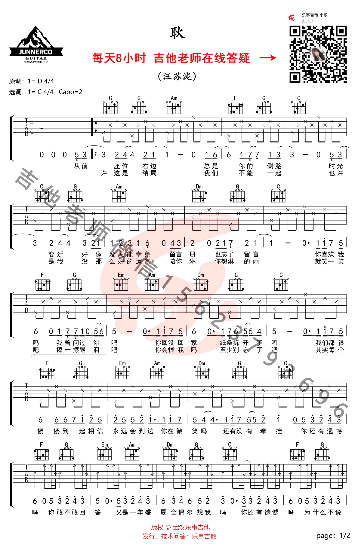 《耿》吉他谱,是电影《最好的我们》毕业季主题曲,由汪苏泷演唱。曲谱以耿六线谱呈现,原调D,选择C调,Capo夹二品。高清图片谱由乐事吉他精心编排,通过看谱啦平台上传分享。附带《耿》吉他弹唱教学视频,提供同学们参照演示学习。歌曲深刻表达了剧中耿耿与余淮分别后的思