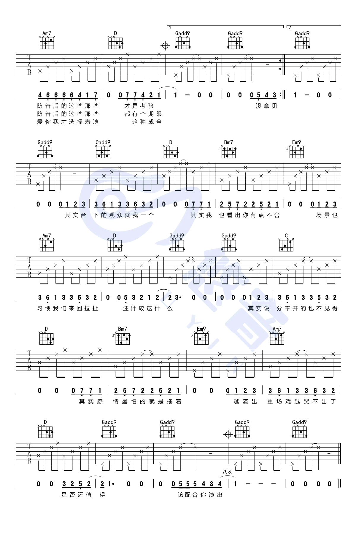 《薛之谦《演员吉他谱》(G调)》内容来自于互联网,不能保证内容的准确性与完整性,仅供学习交流欣赏,请勿用于其它用途,内容版权归原作者及来源网站所有,如有侵犯到您的权益请来信告知,我们将及时删除。