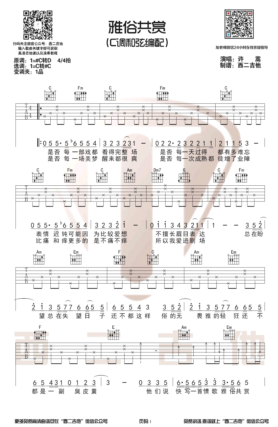 《雅俗共赏》是许嵩创作的一首吉他曲,以六线谱呈现。通过从原调#C转至D,再选用C转#C调,以及西二吉他的编排,演奏者可使用变调夹夹一品。张无忌老师在谱介中分享了对“俗雅”观念的见解,认为这是人们主观划分,导致对大众喜爱的事物产生鄙视,比如所谓的“神曲”,实际上