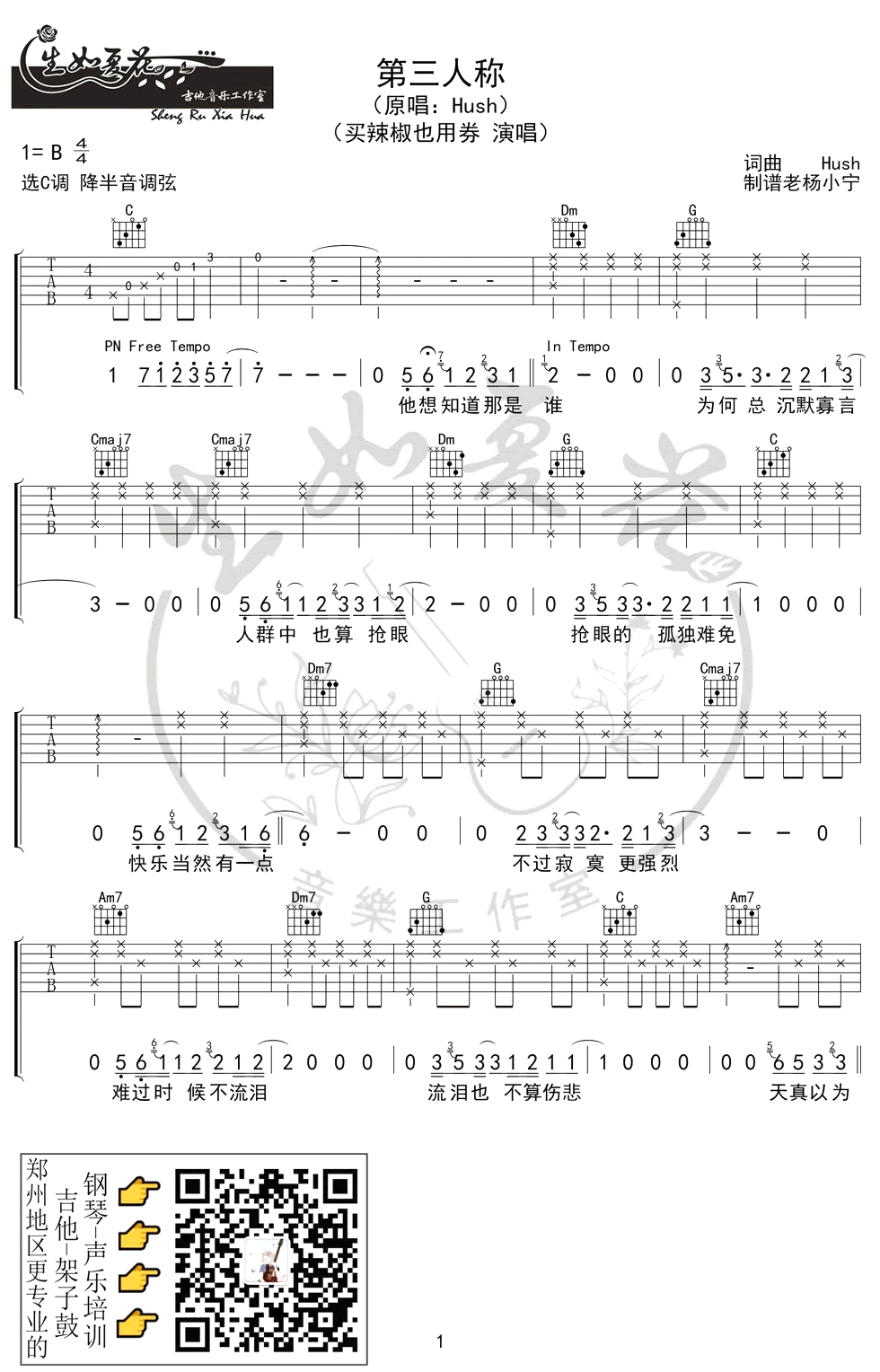 《第三人称》是HUSH的一首吉他弹唱歌曲,以原调B演奏,采用C调指法,降半音调弦。谱曲由老杨小宁编排,以六线谱形式呈现。这首歌曲在吉他演奏中别具特色,通过巧妙的编曲展现了HUSH独特的音乐风格。感谢老杨小宁的辛勤工作,使得这份谱子得以制作和分享。对于喜爱HUS