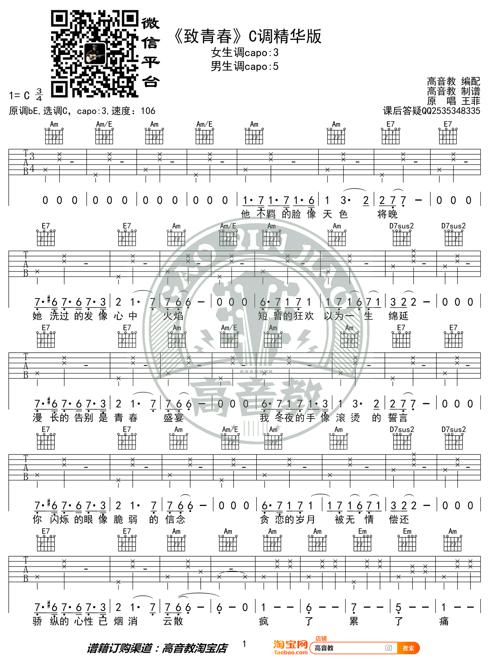 《王菲《致青春吉他谱》(C调)》内容来自于互联网,不能保证内容的准确性与完整性,仅供学习交流欣赏,请勿用于其它用途,内容版权归原作者及来源网站所有,如有侵犯到您的权益请来信告知,我们将及时删除。