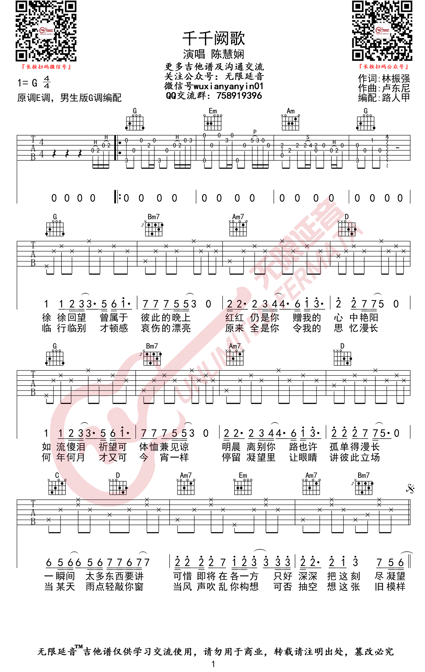 《陈慧娴《千千阙歌吉他谱》(G调)》内容来自于互联网,不能保证内容的准确性与完整性,仅供学习交流欣赏,请勿用于其它用途,内容版权归原作者及来源网站所有,如有侵犯到您的权益请来信告知,我们将及时删除。