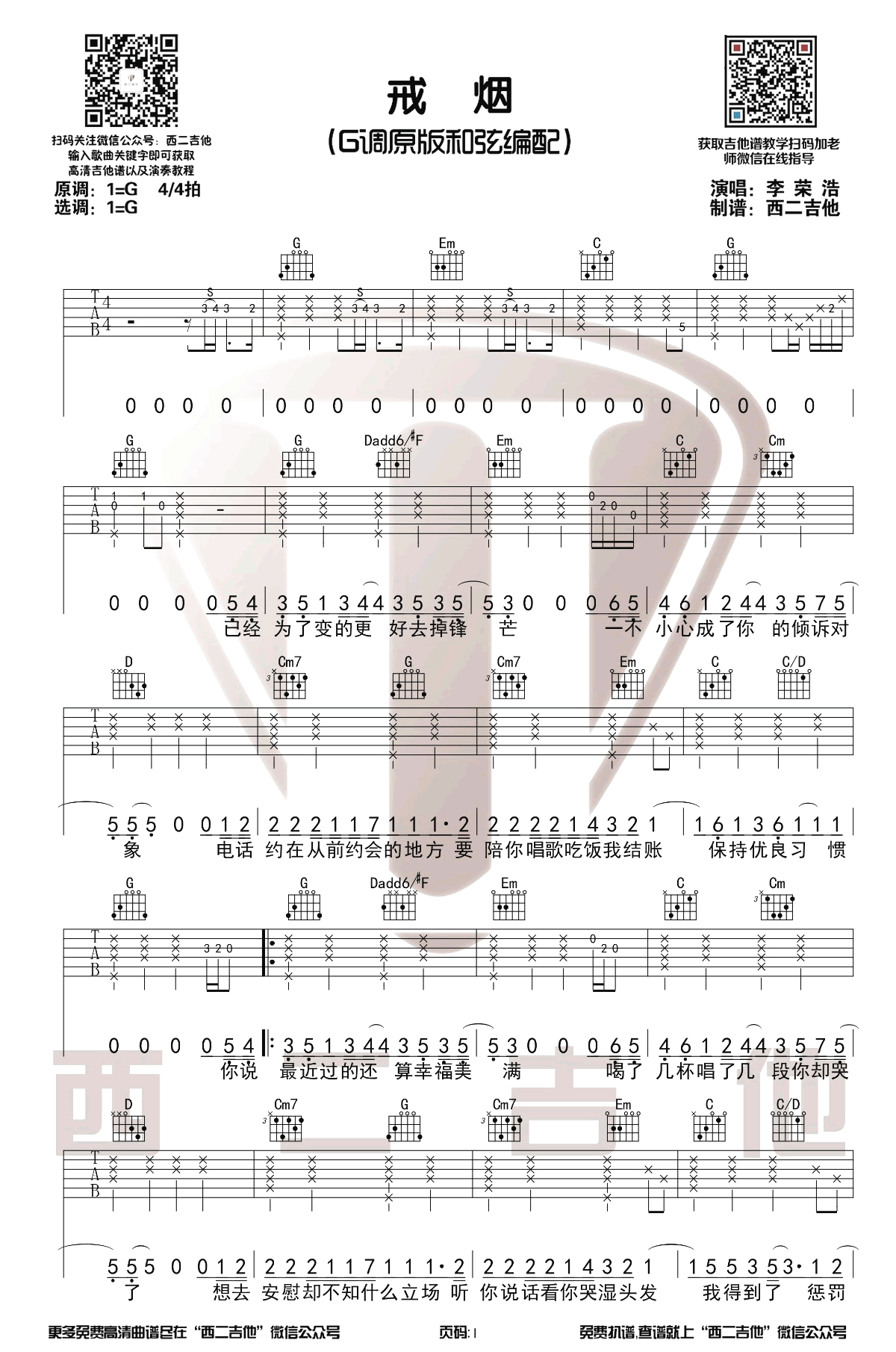 《李荣浩《戒烟吉他谱》(G调)》内容来自于互联网,不能保证内容的准确性与完整性,仅供学习交流欣赏,请勿用于其它用途,内容版权归原作者及来源网站所有,如有侵犯到您的权益请来信告知,我们将及时删除。