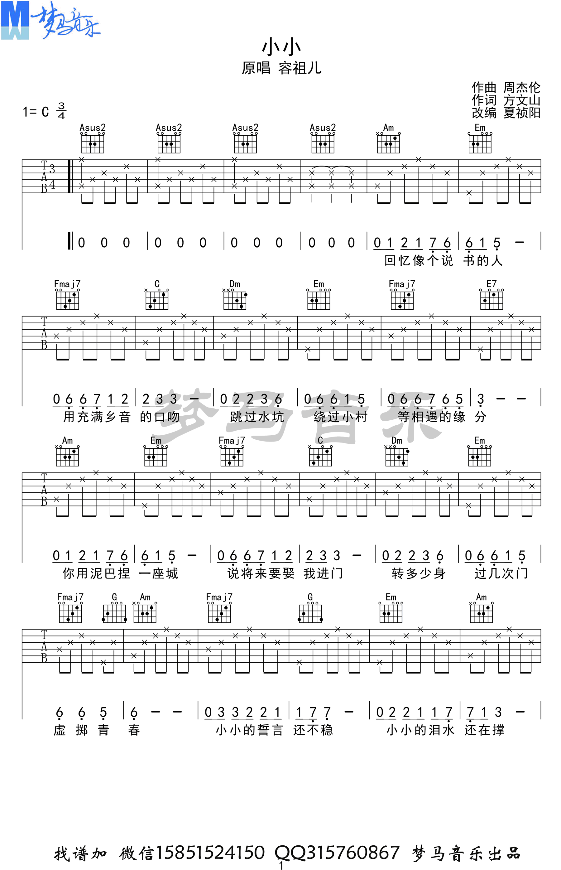 《小小》吉他谱是容祖儿的一首经典代表歌曲,由方文山和周杰伦合作创作。这份小小六线谱以C调弹唱为主,由梦马音乐编配制作,共包含四张高清弹唱图片谱。夏祯阳老师在改编过程中巧妙地将主歌改为指弹,作为歌曲的间奏,提升了整体可弹性。这样的改编让演奏更富有层次,同时难度适