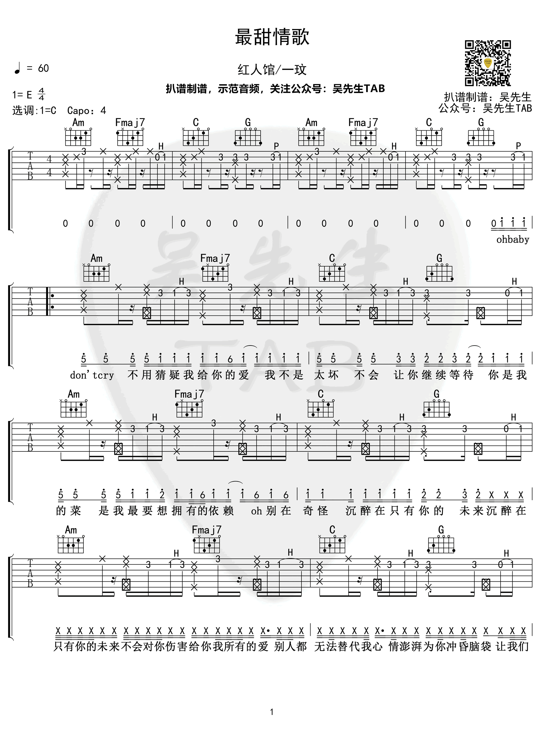《红人馆《最甜情歌吉他谱》(C调)》内容来自于互联网,不能保证内容的准确性与完整性,仅供学习交流欣赏,请勿用于其它用途,内容版权归原作者及来源网站所有,如有侵犯到您的权益请来信告知,我们将及时删除。