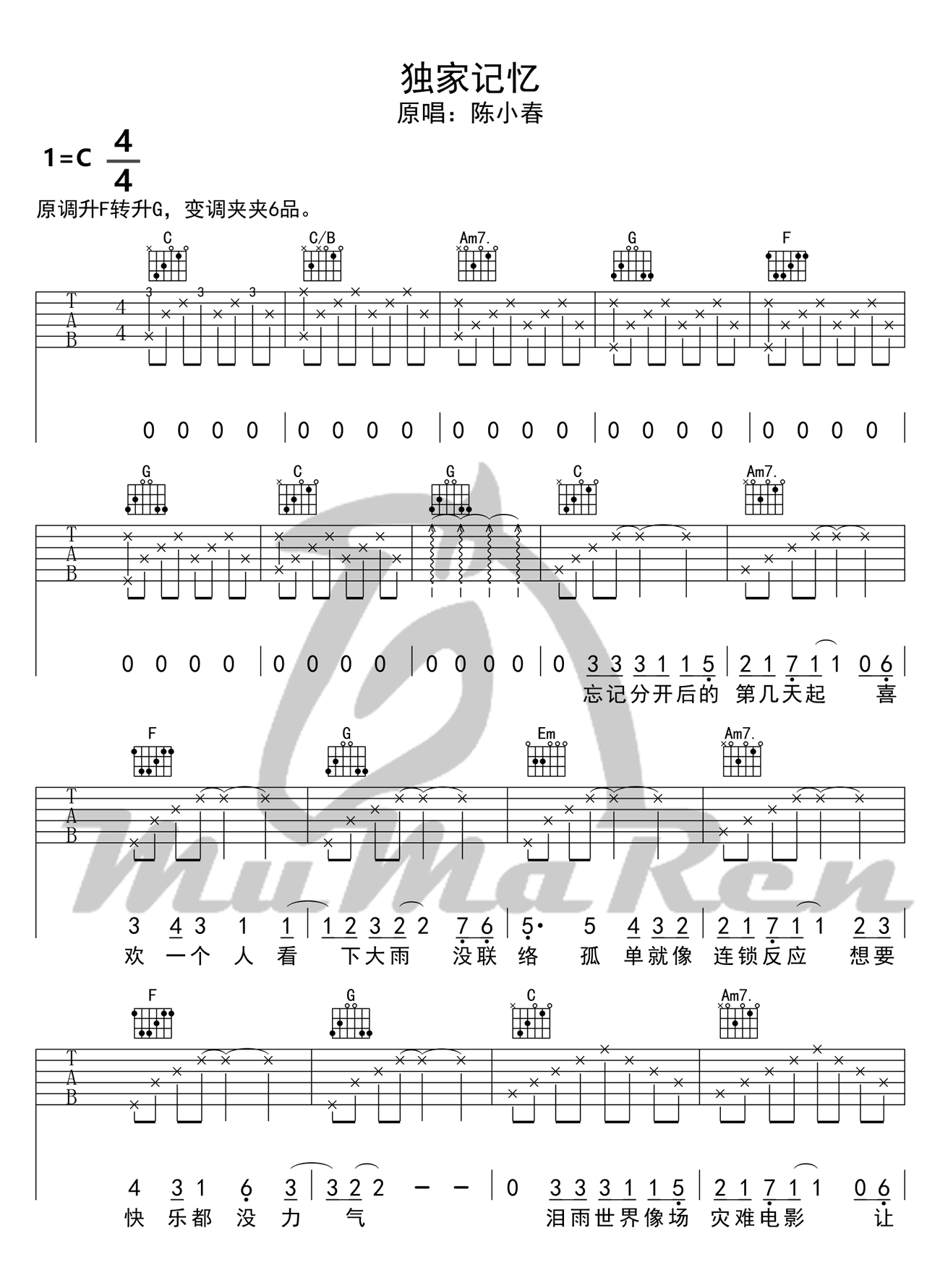 "独家记忆" 是一首由陈小春演唱的经典歌曲,这份吉他谱以C调指法呈现,通过升F转升G和变调夹的方式,六线谱展示了这首歌曲的乐谱。曲谱以五张图片谱例分两页展示。这首歌深刻地捕捉了人们内心情感的波动。失恋时,似乎所有的情歌都在为你而唱,这首《独家记忆》不仅仅是陈小