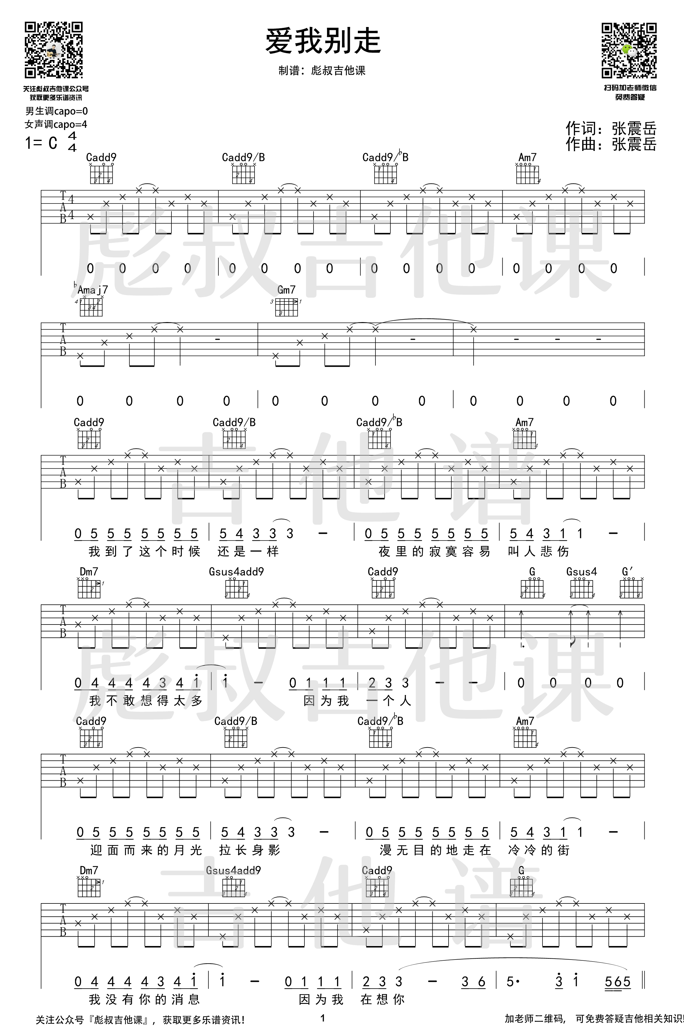 《张震岳《爱我别走吉他谱》(C调)》内容来自于互联网,不能保证内容的准确性与完整性,仅供学习交流欣赏,请勿用于其它用途,内容版权归原作者及来源网站所有,如有侵犯到您的权益请来信告知,我们将及时删除。