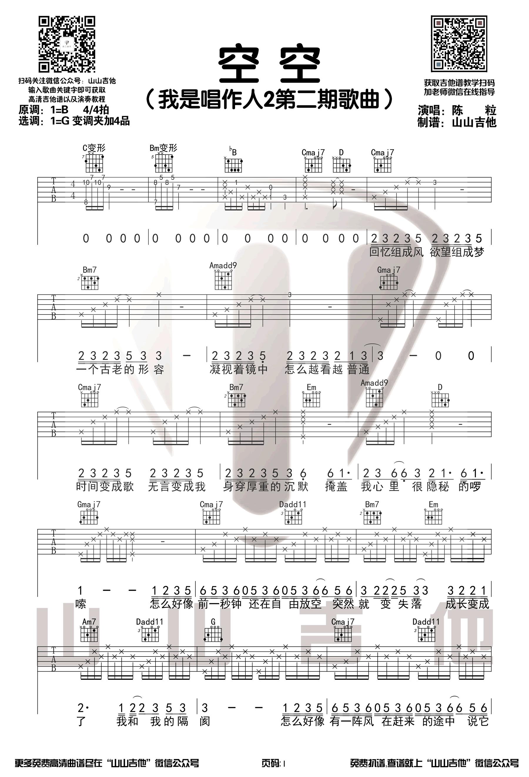 陈粒演唱的《空空》是原创音乐节目《我是唱作人》中的一首深受喜爱的歌曲。吉他谱采用G调指法编配,通过变调夹夹在第四品,呈现空空六线谱。谱中附有三张清晰的弹唱图片,由山山吉他制作,感谢他们的贡献。这首歌一经演唱就迅速赢得了众多网友的欢心。为方便喜欢这首歌的朋友学习