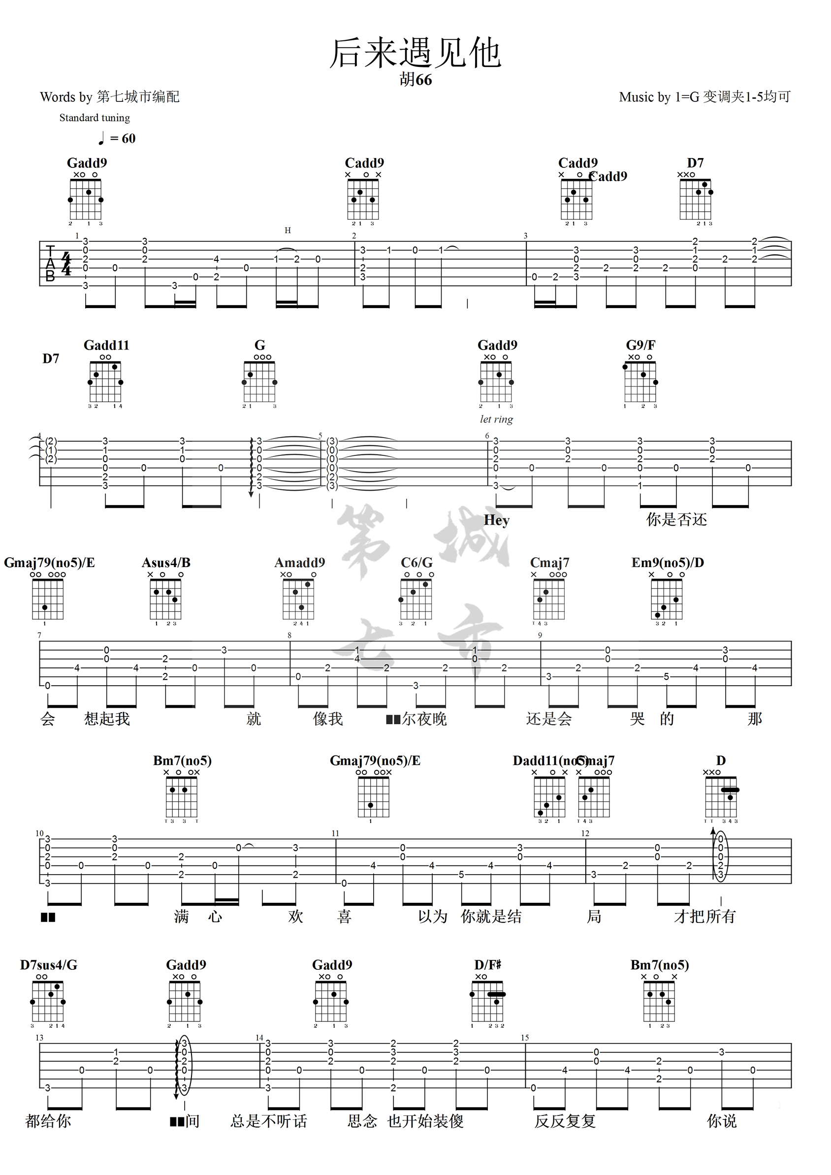 《胡66《后来遇见他吉他谱》(G调)》内容来自于互联网,不能保证内容的准确性与完整性,仅供学习交流欣赏,请勿用于其它用途,内容版权归原作者及来源网站所有,如有侵犯到您的权益请来信告知,我们将及时删除。