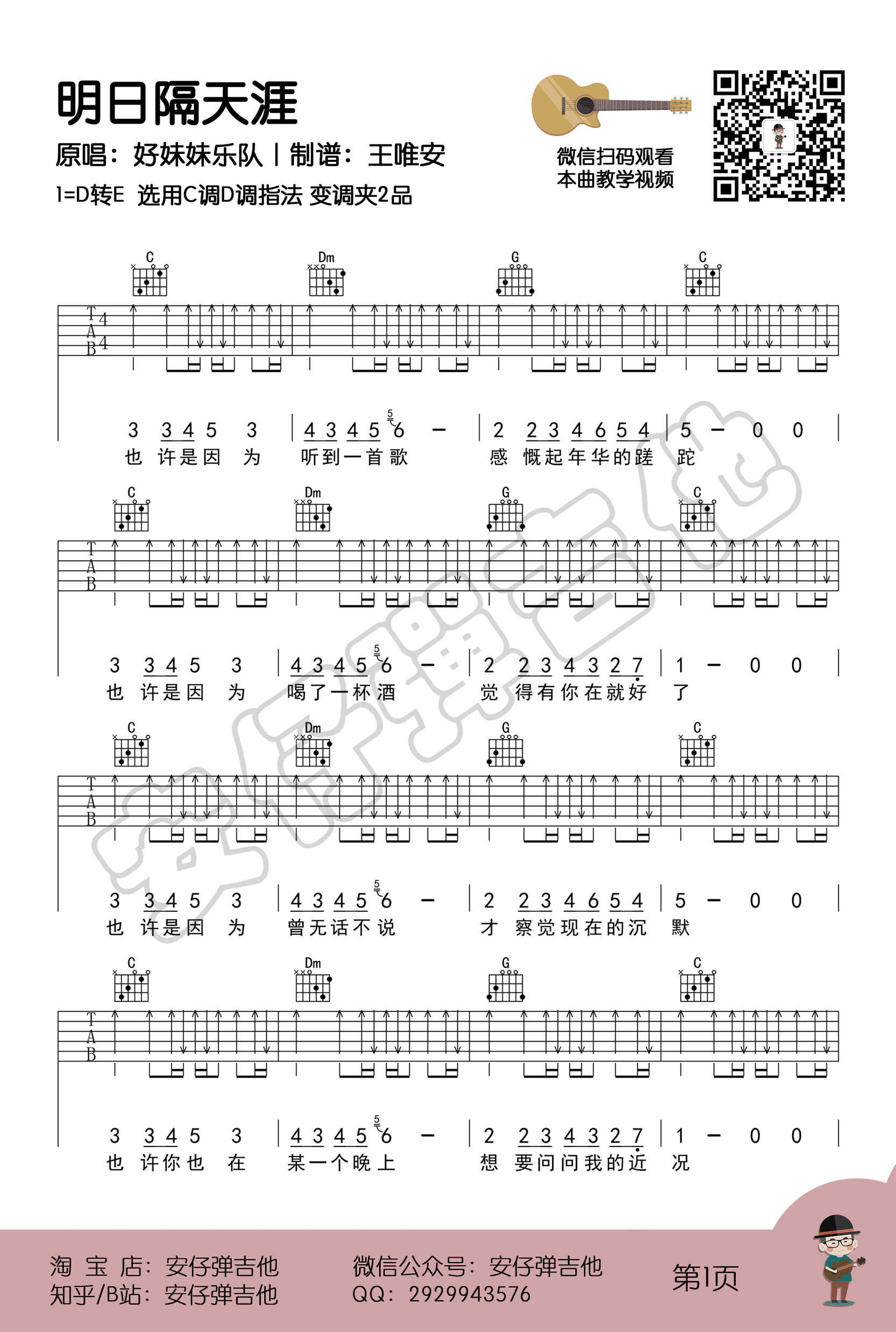 《明日隔天涯》是好妹妹乐队演唱的一首温暖的民谣歌曲,吉他谱以C转D指法,变调夹夹第二品。曲谱采用六线谱,高清图片共四张,由安仔精心编配。主歌和声套路简单却别具特色,1231的进行方式在流行音乐中相对罕见,然而在校园民谣中颇为普遍,对于刚刚起步的创作者而言,是个