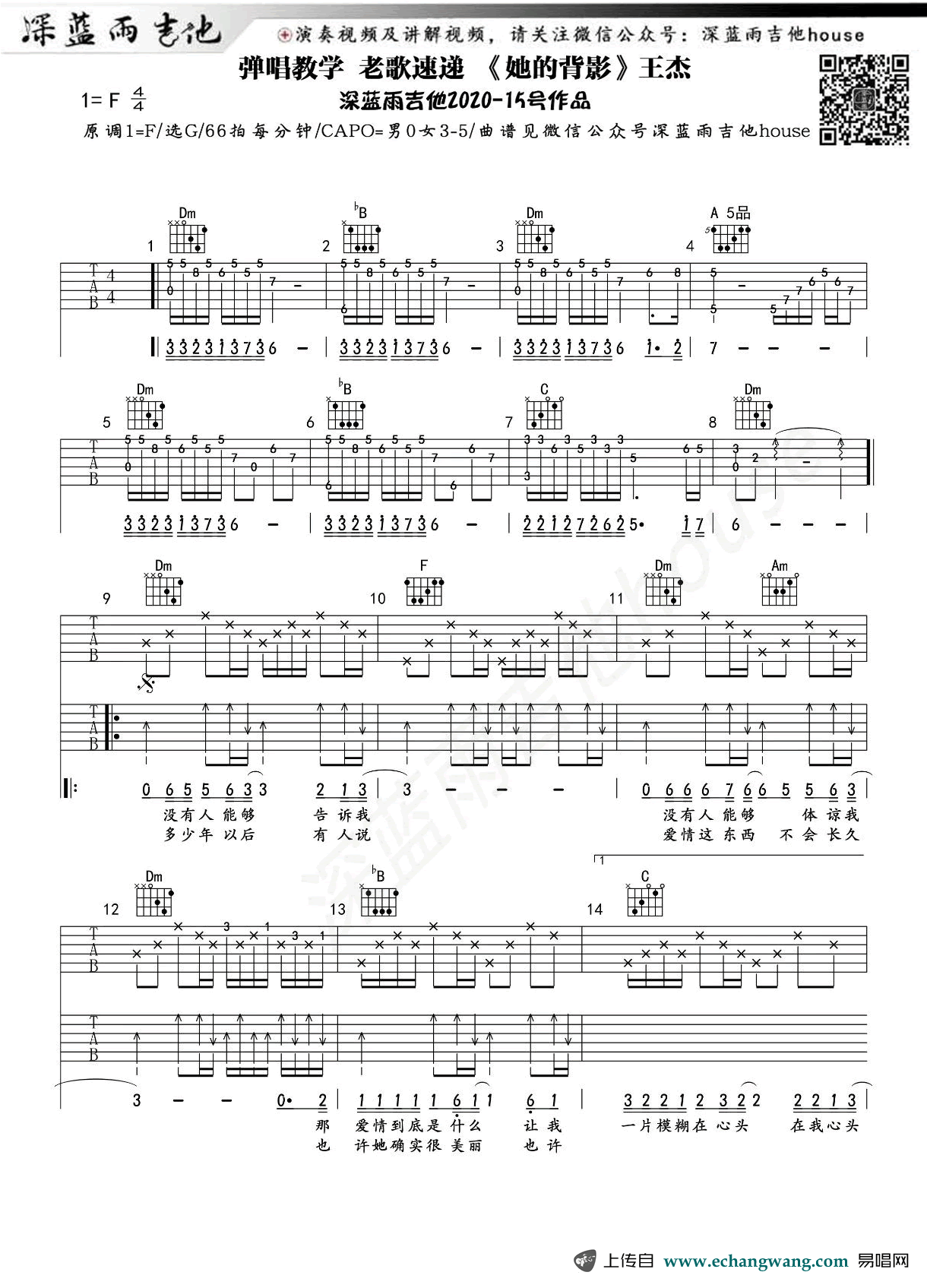 王杰的经典老歌《她的背影》,以F调为原调,C调为选调,男生不需使用CAPO,而女生则需使用3-5品。三张清晰的吉他弹唱图片谱由深蓝雨吉他编配,并在易唱吉他谱网发布更新。这首歌曲悲情而动人,表达了忧伤和孤独,令人感到心痛。它曾是电视剧《深情无怨尤》的主题曲,粤语