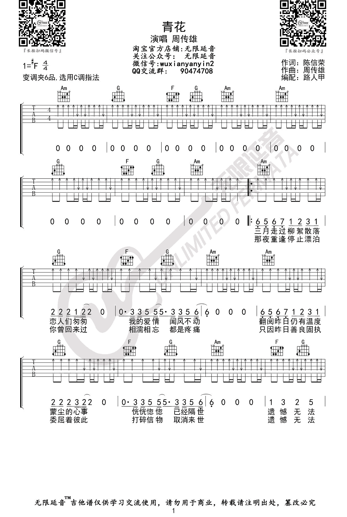 周传雄的《青花》吉他谱以原调升F、选调C,附带变调夹夹六品。共三张弹唱图片谱,感谢无限延音出品、易唱网整理上传。这首歌曲曾在某音乐软件榜首,再次勾起人们的回忆。它是情歌教父的经典之作,深刻诠释了红尘中的悲欢离合。歌曲清澈唱出了美丽爱情的神圣,也映射出了心境落寞